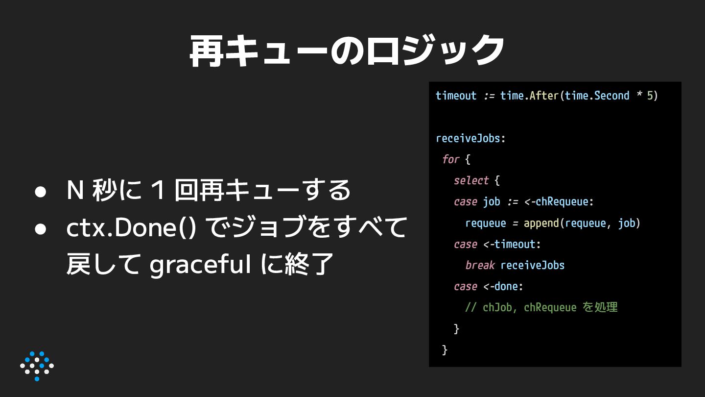 graceful に終了 timeout := time.After(time.Second * 5) receiveJobs: for { select { case job := <-chRequeue: requeue = append(requeue, job) case <-timeout: break receiveJobs case <-done: // chJob, chRequeue を処理 } }