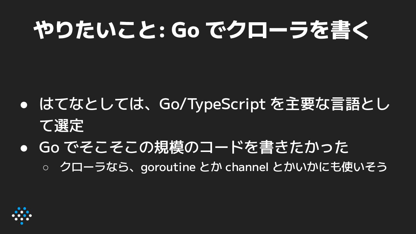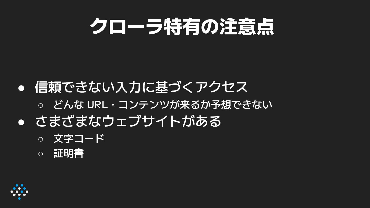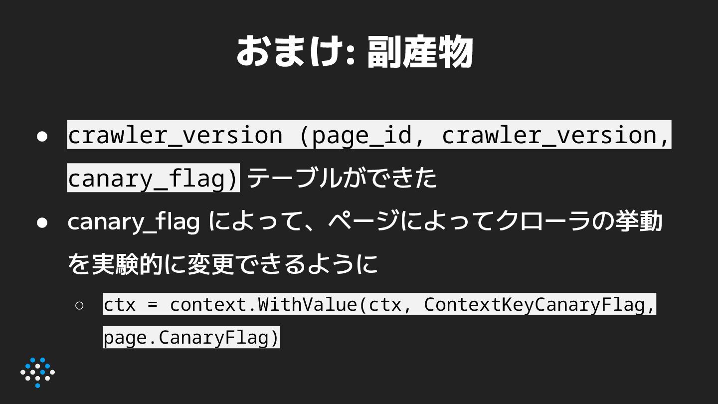 によって、ページによってクローラの挙動 を実験的に変更できるように ◦ ctx = context.WithValue(ctx, ContextKeyCanaryFlag, page.CanaryFlag)