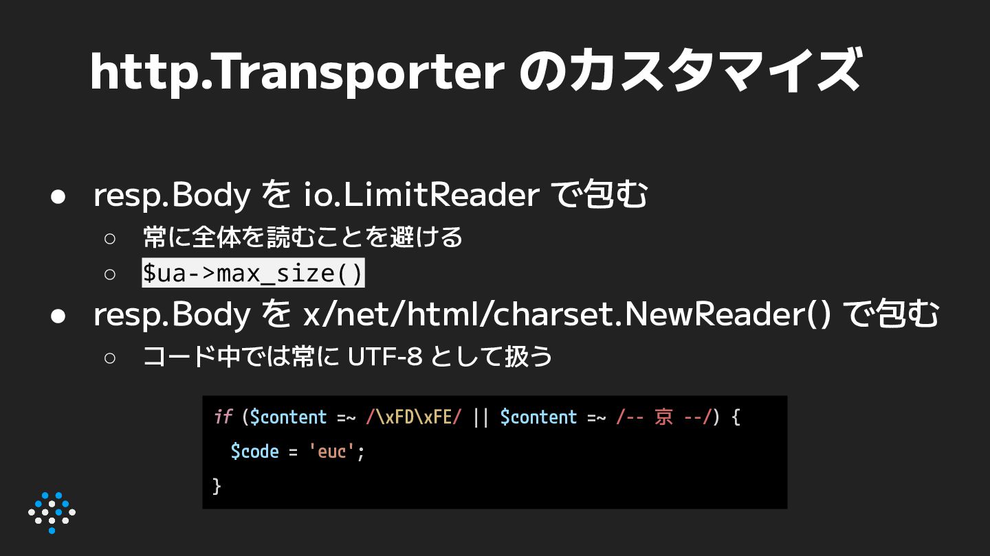 • resp.Body を x/net/html/charset.NewReader() で包む ◦ コード中では常に UTF-8 として扱う if ($content =~ /\xFD\xFE/ || $content =~ /-- 京 --/) { $code = 'euc'; }