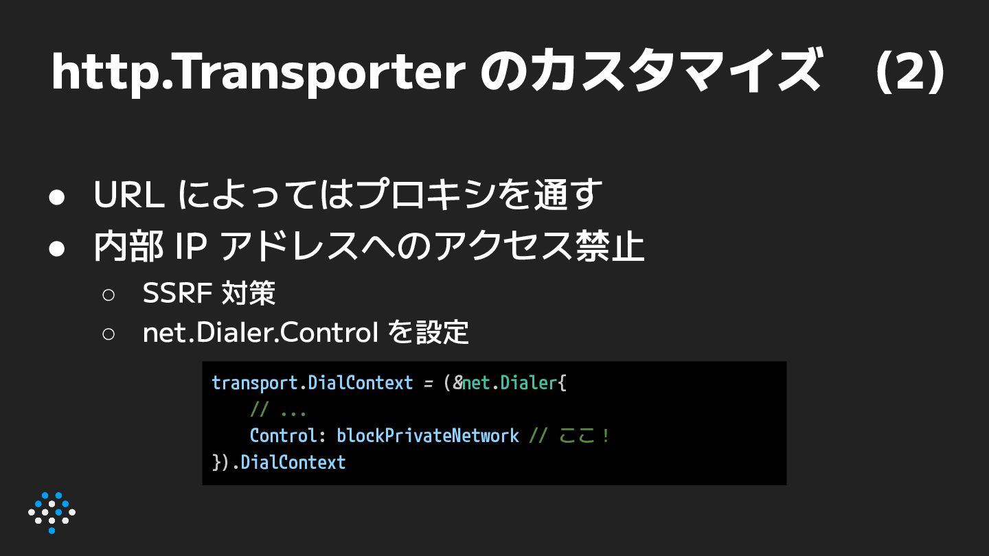 ◦ SSRF 対策 ◦ net.Dialer.Control を設定 transport.DialContext = (&net.Dialer{ // ... Control: blockPrivateNetwork // ここ! }).DialContext