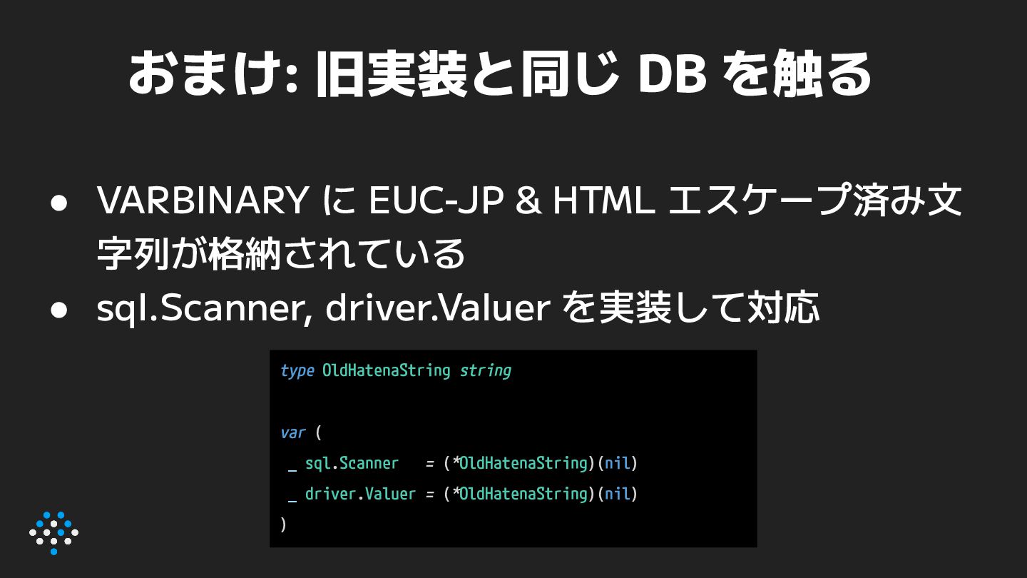 エスケープ済み文 字列が格納されている • sql.Scanner, driver.Valuer を実装して対応 type OldHatenaString string var ( _ sql.Scanner = (*OldHatenaString)(nil) _ driver.Valuer = (*OldHatenaString)(nil) )