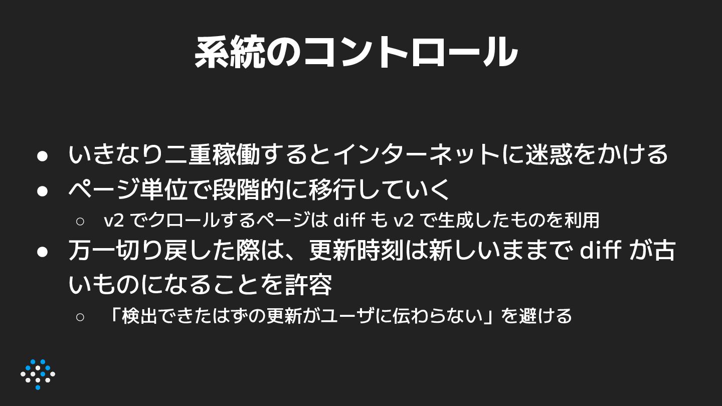 16. 系統のコントロール • いきなり二重稼働するとインターネットに迷惑をかける • ページ単位で段階的に移行していく ◦ v2 でクロールするページは diff も