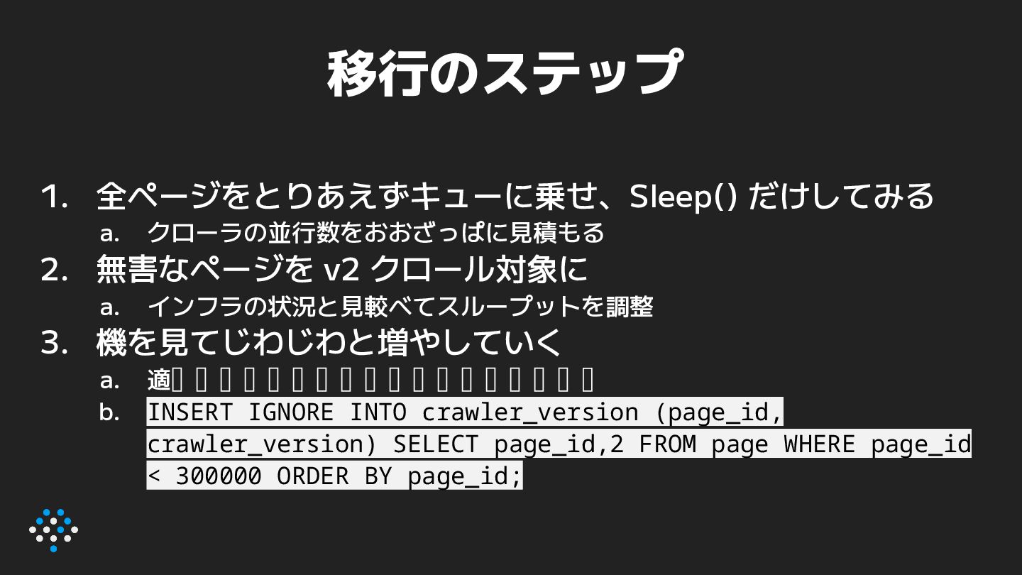 a. インフラの状況と見較べてスループットを調整 3. 機を見てじわじわと増やしていく a. 適当なタイミングで、新規登録ページも v2 対象に b. INSERT IGNORE INTO crawler_version (page_id, crawler_version) SELECT page_id,2 FROM page WHERE page_id < 300000 ORDER BY page_id;