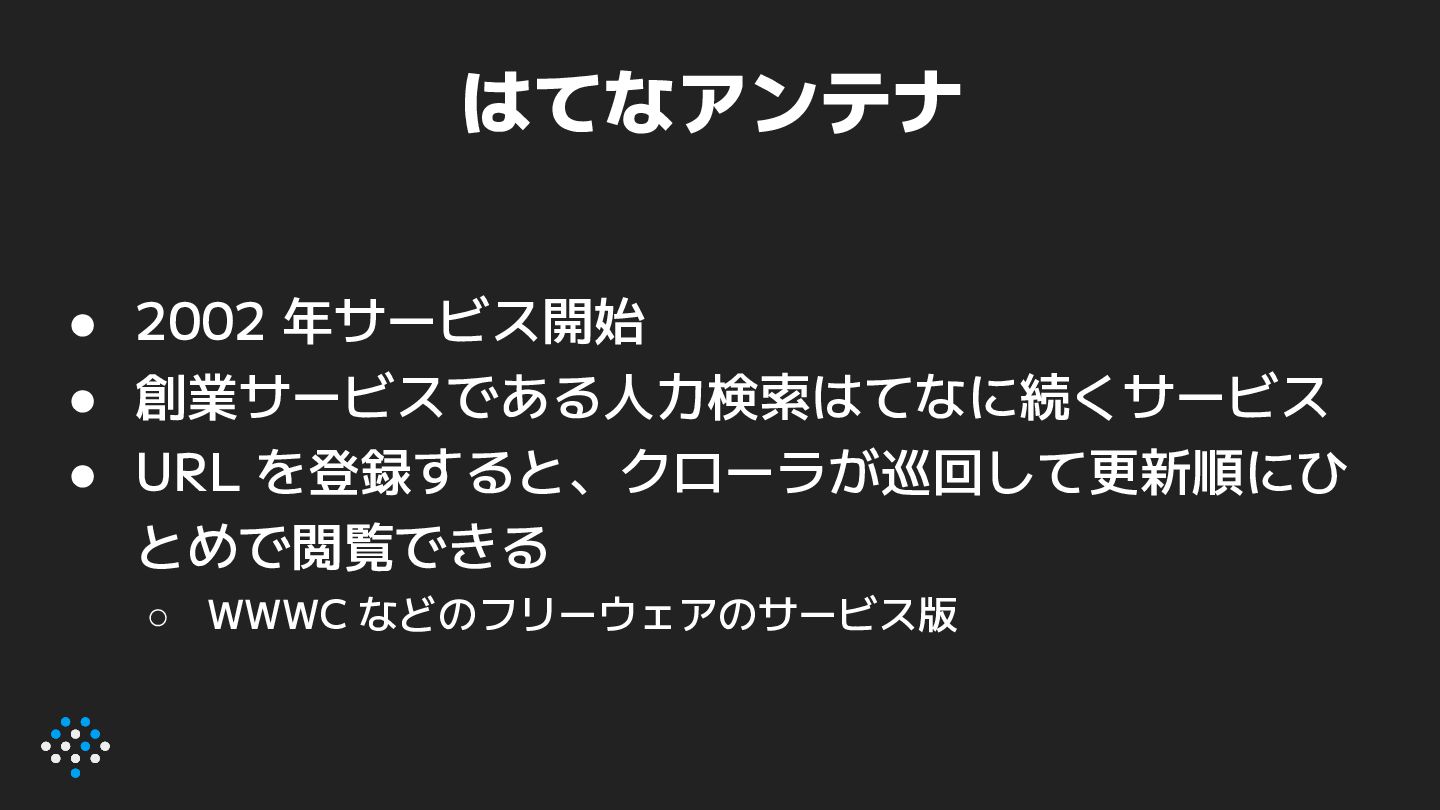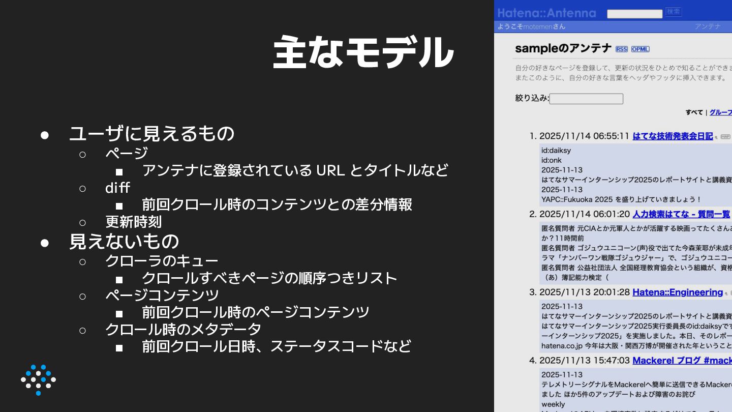 2. 主なモデル • ユーザに見えるもの ◦ ページ ▪ アンテナに登録されている URL とタイトルなど ◦