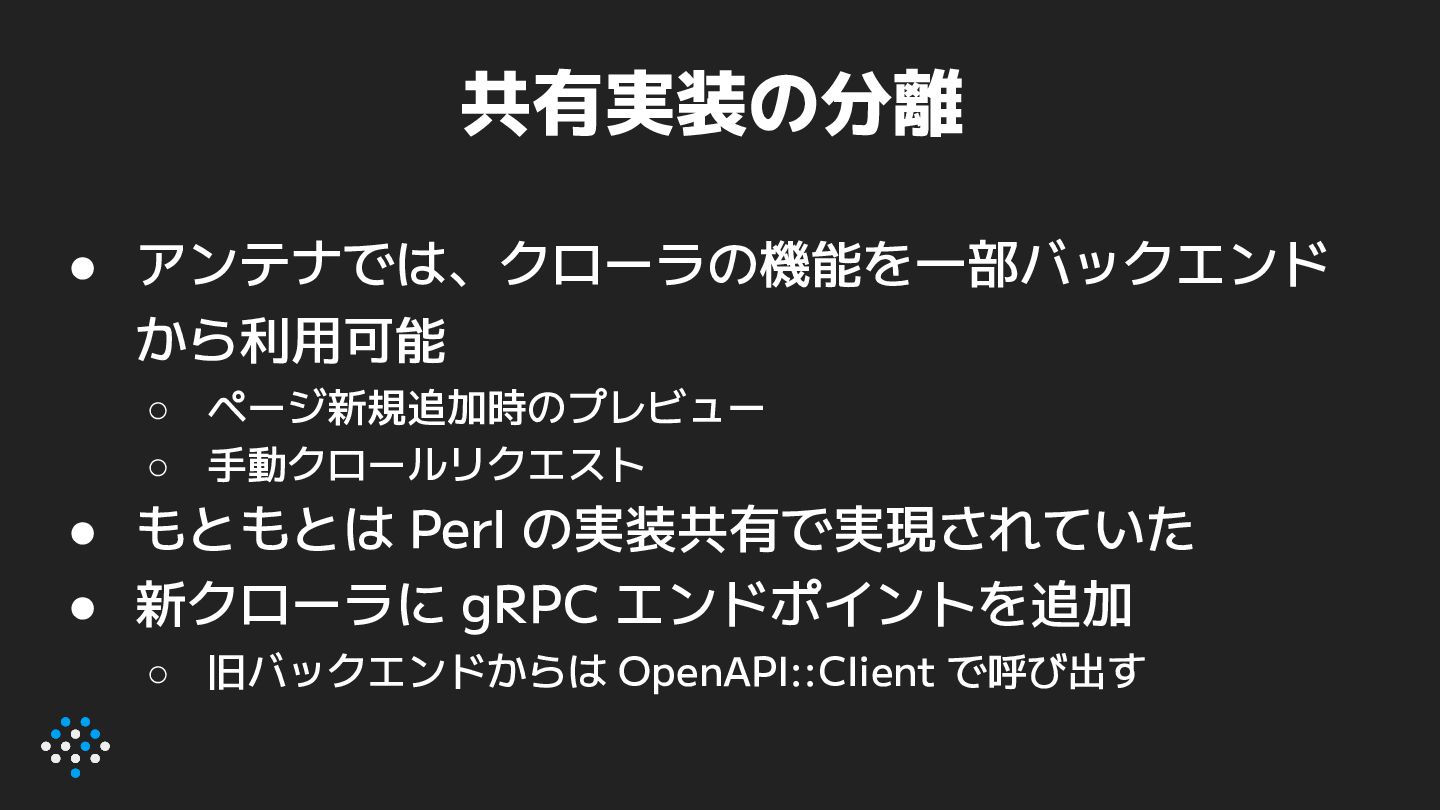 Perl の実装共有で実現されていた • 新クローラに gRPC エンドポイントを追加 ◦ 旧バックエンドからは OpenAPI::Client で呼び出す