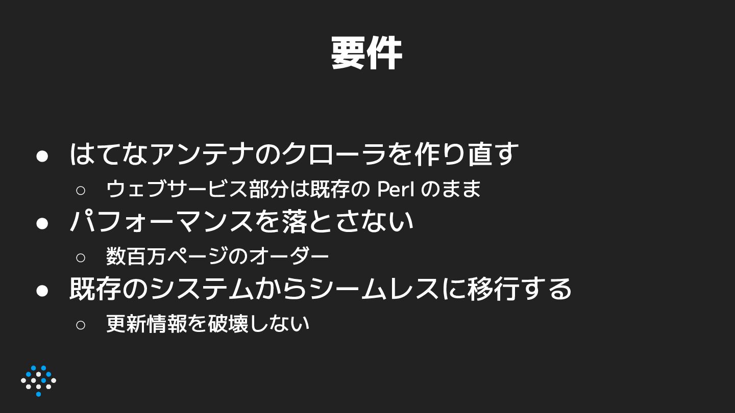 1. 要件 • はてなアンテナのクローラを作り直す ◦ ウェブサービス部分は既存の Perl のまま • パフォーマンスを落とさない ◦
