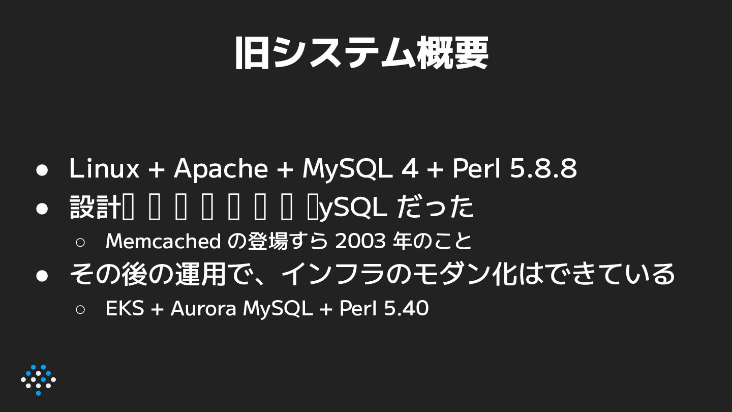5.8.8 • 設計当時、すべてが MySQL だった ◦ Memcached の登場すら 2003 年のこと • その後の運用で、インフラのモダン化はできている ◦ EKS + Aurora MySQL + Perl 5.40
