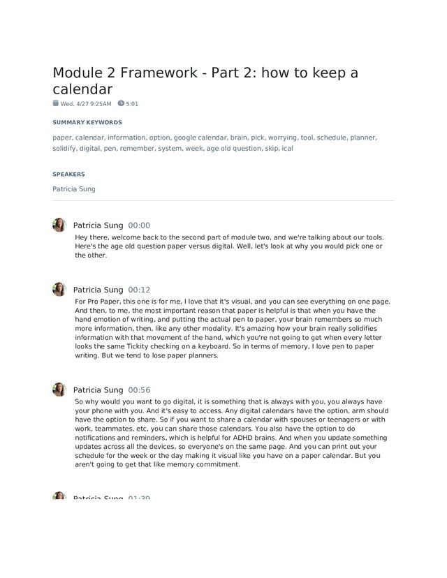calendar Wed, 4/27 9:25AM 5:01 SUMMARY KEYWORDS paper, calendar, information, option, google calendar, brain, pick, worrying, tool, schedule, planner, solidify, digital, pen, remember, system, week, age old question, skip, ical SPEAKERS Patricia Sung Patricia Sung 00:00 Hey there, welcome back to the second part of module two, and we're talking about our tools. Here's the age old question paper versus digital. Well, let's look at why you would pick one or the other. Patricia Sung 00:12 For Pro Paper, this one is for me, I love that it's visual, and you can see everything on one page. And then, to me, the most important reason that paper is helpful is that when you have the hand emotion of writing, and putting the actual pen to paper, your brain remembers so much more information, then, like any other modality. It's amazing how your brain really solidifies information with that movement of the hand, which you're not going to get when every letter looks the same Tickity checking on a keyboard. So in terms of memory, I love pen to paper writing. But we tend to lose paper planners. Patricia Sung 00:56 So why would you want to go digital, it is something that is always with you, you always have your phone with you. And it's easy to access. Any digital calendars have the option, arm should have the option to share. So if you want to share a calendar with spouses or teenagers or with work, teammates, etc, you can share those calendars. You also have the option to do notifications and reminders, which is helpful for ADHD brains. And when you update something updates across all the devices, so everyone's on the same page. And you can print out your schedule for the week or the day making it visual like you have on a paper calendar. But you aren't going to get that like memory commitment. Patricia Sung 01:39