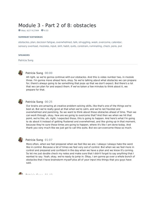 9:27AM 4:33 SUMMARY KEYWORDS obstacles, plan, decision fatigue, overwhelmed, talk, struggling, week, overcome, calendar, sensory overload, modules, input, skill, habit, quits, constrain, ruminating, check, pens, put SPEAKERS Patricia Sung Patricia Sung 00:00 All right, so we're gonna continue with our obstacles. And this is video number two, in module three. I'm gonna move ahead here, okay. So we're talking about what obstacles we can prepare for, there's always going to be something that pops up that we don't expect. But there's a lot that we can plan for and expect them. If we've taken a few minutes to think about it, we prepare for that. Patricia Sung 00:25 Our brains are amazing at creative problem solving skills, like that's one of the things we're best at. But we're really good at that when we're calm, and we're not frazzled and overwhelmed and panicking. So we want to think about those obstacles ahead of time. Then we can work through, okay, how are we going to overcome that? And then we when we hit that point, we're like, oh, right, I expected those, this is going to happen. And here's what I'm going to do about it instead of getting flustered and overwhelmed, and like giving up in that moment, because they're sure those times are going to happen, where it's like I am done today. And thank you very much like we just got to call this quits. But we can overcome those so much. Patricia Sung 01:07 More often, when we feel prepared when we feel like we are. I always I always hate the word like in control. Because a lot of times we feel very out of control. But when we we feel more in control and prepared and confident in the day when we have a plan and we know it's coming. So let me just double check my notes and make sure that I didn't forget to say anything that I wanted to say. Yeah, okay, we're ready to jump in. Okay, I am gonna go over a whole bunch of obstacles that I have brainstorm myself plus all of your input into things that you guys have said. Patricia Sung 01:43