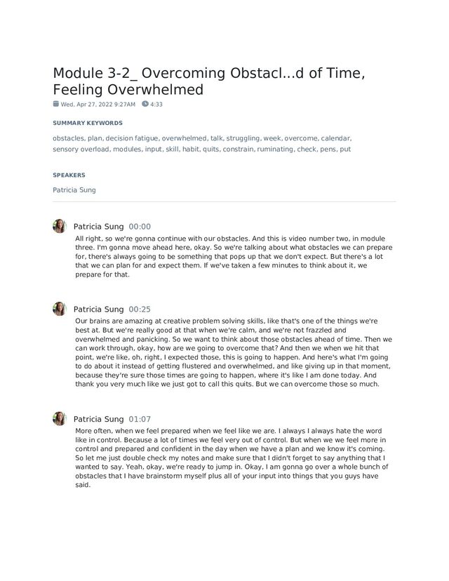 27, 2022 9:27AM 4:33 SUMMARY KEYWORDS obstacles, plan, decision fatigue, overwhelmed, talk, struggling, week, overcome, calendar, sensory overload, modules, input, skill, habit, quits, constrain, ruminating, check, pens, put SPEAKERS Patricia Sung Patricia Sung 00:00 All right, so we're gonna continue with our obstacles. And this is video number two, in module three. I'm gonna move ahead here, okay. So we're talking about what obstacles we can prepare for, there's always going to be something that pops up that we don't expect. But there's a lot that we can plan for and expect them. If we've taken a few minutes to think about it, we prepare for that. Patricia Sung 00:25 Our brains are amazing at creative problem solving skills, like that's one of the things we're best at. But we're really good at that when we're calm, and we're not frazzled and overwhelmed and panicking. So we want to think about those obstacles ahead of time. Then we can work through, okay, how are we going to overcome that? And then we when we hit that point, we're like, oh, right, I expected those, this is going to happen. And here's what I'm going to do about it instead of getting flustered and overwhelmed, and like giving up in that moment, because they're sure those times are going to happen, where it's like I am done today. And thank you very much like we just got to call this quits. But we can overcome those so much. Patricia Sung 01:07 More often, when we feel prepared when we feel like we are. I always I always hate the word like in control. Because a lot of times we feel very out of control. But when we we feel more in control and prepared and confident in the day when we have a plan and we know it's coming. So let me just double check my notes and make sure that I didn't forget to say anything that I wanted to say. Yeah, okay, we're ready to jump in. Okay, I am gonna go over a whole bunch of obstacles that I have brainstorm myself plus all of your input into things that you guys have said.