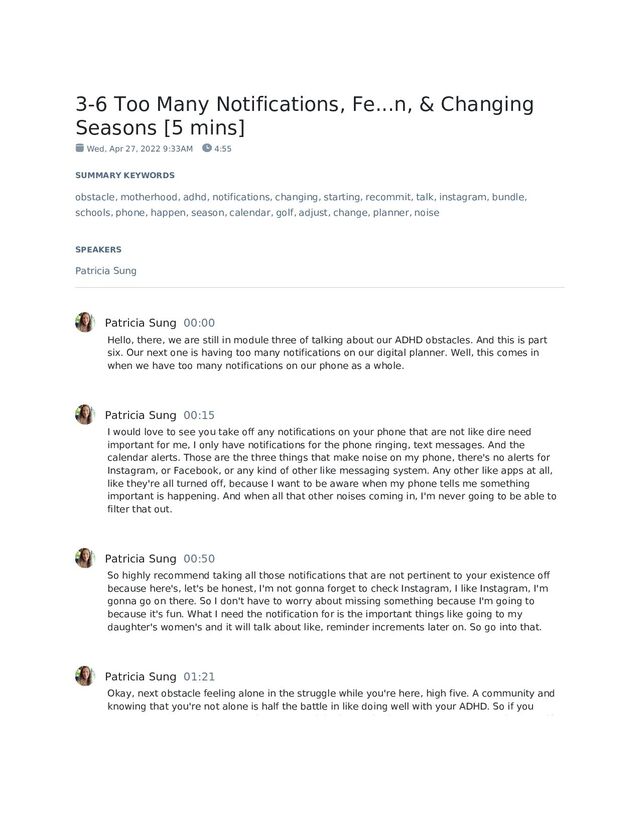 Wed, Apr 27, 2022 9:33AM 4:55 SUMMARY KEYWORDS obstacle, motherhood, adhd, notifications, changing, starting, recommit, talk, instagram, bundle, schools, phone, happen, season, calendar, golf, adjust, change, planner, noise SPEAKERS Patricia Sung Patricia Sung 00:00 Hello, there, we are still in module three of talking about our ADHD obstacles. And this is part six. Our next one is having too many notifications on our digital planner. Well, this comes in when we have too many notifications on our phone as a whole. Patricia Sung 00:15 I would love to see you take off any notifications on your phone that are not like dire need important for me, I only have notifications for the phone ringing, text messages. And the calendar alerts. Those are the three things that make noise on my phone, there's no alerts for Instagram, or Facebook, or any kind of other like messaging system. Any other like apps at all, like they're all turned off, because I want to be aware when my phone tells me something important is happening. And when all that other noises coming in, I'm never going to be able to filter that out. Patricia Sung 00:50 So highly recommend taking all those notifications that are not pertinent to your existence off because here's, let's be honest, I'm not gonna forget to check Instagram, I like Instagram, I'm gonna go on there. So I don't have to worry about missing something because I'm going to because it's fun. What I need the notification for is the important things like going to my daughter's women's and it will talk about like, reminder increments later on. So go into that. Patricia Sung 01:21 Okay, next obstacle feeling alone in the struggle while you're here, high five. A community and knowing that you're not alone is half the battle in like doing well with your ADHD. So if you need some support, you can enjoy, you can join the motherhood and ADHD Facebook group, if