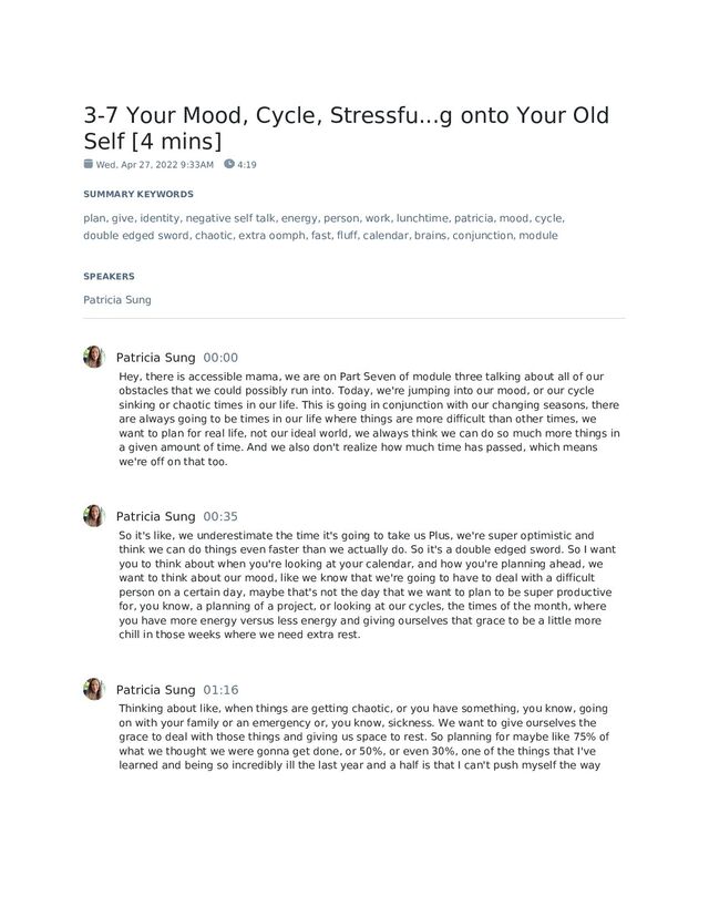 mins] Wed, Apr 27, 2022 9:33AM 4:19 SUMMARY KEYWORDS plan, give, identity, negative self talk, energy, person, work, lunchtime, patricia, mood, cycle, double edged sword, chaotic, extra oomph, fast, fluff, calendar, brains, conjunction, module SPEAKERS Patricia Sung Patricia Sung 00:00 Hey, there is accessible mama, we are on Part Seven of module three talking about all of our obstacles that we could possibly run into. Today, we're jumping into our mood, or our cycle sinking or chaotic times in our life. This is going in conjunction with our changing seasons, there are always going to be times in our life where things are more difficult than other times, we want to plan for real life, not our ideal world, we always think we can do so much more things in a given amount of time. And we also don't realize how much time has passed, which means we're off on that too. Patricia Sung 00:35 So it's like, we underestimate the time it's going to take us Plus, we're super optimistic and think we can do things even faster than we actually do. So it's a double edged sword. So I want you to think about when you're looking at your calendar, and how you're planning ahead, we want to think about our mood, like we know that we're going to have to deal with a difficult person on a certain day, maybe that's not the day that we want to plan to be super productive for, you know, a planning of a project, or looking at our cycles, the times of the month, where you have more energy versus less energy and giving ourselves that grace to be a little more chill in those weeks where we need extra rest. Patricia Sung 01:16 Thinking about like, when things are getting chaotic, or you have something, you know, going on with your family or an emergency or, you know, sickness. We want to give ourselves the grace to deal with those things and giving us space to rest. So planning for maybe like 75% of what we thought we were gonna get done, or 50%, or even 30%, one of the things that I've learned and being so incredibly ill the last year and a half is that I can't push myself the way