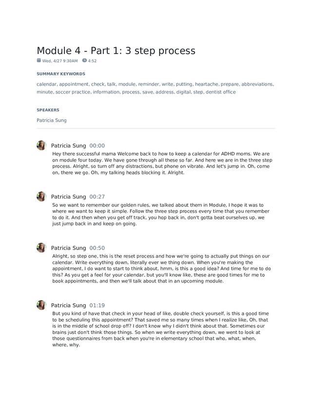 9:30AM 4:52 SUMMARY KEYWORDS calendar, appointment, check, talk, module, reminder, write, putting, heartache, prepare, abbreviations, minute, soccer practice, information, process, save, address, digital, step, dentist office SPEAKERS Patricia Sung Patricia Sung 00:00 Hey there successful mama Welcome back to how to keep a calendar for ADHD moms. We are on module four today. We have gone through all these so far. And here we are in the three step process. Alright, so turn off any distractions, but phone on vibrate. And let's jump in. Oh, come on, there we go. Oh, my talking heads blocking it. Alright. Patricia Sung 00:27 So we want to remember our golden rules, we talked about them in Module, I hope it was to where we want to keep it simple. Follow the three step process every time that you remember to do it. And then when you get off track, you hop back in, don't gotta beat ourselves up, we just jump back in and keep on going. Patricia Sung 00:50 Alright, so step one, this is the reset process and how we're going to actually put things on our calendar. Write everything down, literally ever we thing down. When you're making the appointment, I do want to start to think about, hmm, is this a good idea? And time for me to do this? As you get a feel for your calendar, but you'll know like, these are good times for me to book appointments, and then we'll talk about that in an upcoming module. Patricia Sung 01:19 But you kind of have that check in your head of like, double check yourself, is this a good time to be scheduling this appointment? That saved me so many times when I realize like, Oh, that is in the middle of school drop off? I don't know why I didn't think about that. Sometimes our brains just don't think those things. So when we write everything down, we went to look at those questionnaires from back when you're in elementary school that who, what, when, where, why.