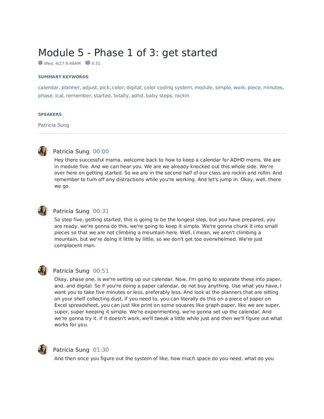 4/27 9:46AM 4:31 SUMMARY KEYWORDS calendar, planner, adjust, pick, color, digital, color coding system, module, simple, work, piece, minutes, phase, ical, remember, started, totally, adhd, baby steps, rockin SPEAKERS Patricia Sung Patricia Sung 00:00 Hey there successful mama, welcome back to how to keep a calendar for ADHD moms. We are in module five. And we can hear you. We are we already knocked out this whole side. We're over here on getting started. So we are in the second half of our class are rockin and rollin. And remember to turn off any distractions while you're working. And let's jump in. Okay, well, there we go. Patricia Sung 00:31 So step five, getting started, this is going to be the longest step, but you have prepared, you are ready, we're gonna do this, we're going to keep it simple. We're gonna chunk it into small pieces so that we are not climbing a mountain here. Well, I mean, we aren't climbing a mountain, but we're doing it little by little, so we don't get too overwhelmed. We're just complacent man. Patricia Sung 00:51 Okay, phase one, is we're setting up our calendar. Now, I'm going to separate these into paper, and, and digital. So if you're doing a paper calendar, do not buy anything. Use what you have, I want you to take five minutes or less, preferably less. And look at the planners that are sitting on your shelf collecting dust, if you need to, you can literally do this on a piece of paper on Excel spreadsheet, you can just like print on some squares like graph paper, like we are super, super, super keeping it simple. We're experimenting, we're gonna set up the calendar. And we're gonna try it. If it doesn't work, we'll tweak a little while just and then we'll figure out what works for you. Patricia Sung 01:30 And then once you figure out the system of like, how much space do you need, what do you