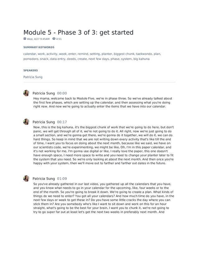 4/27 9:45AM 4:51 SUMMARY KEYWORDS calendar, work, activity, week, enter, remind, setting, planter, biggest chunk, taekwondo, plan, pomodoro, snack, data entry, deeds, create, next few days, phase, system, big kahuna SPEAKERS Patricia Sung Patricia Sung 00:00 Hey mama, welcome back to Module Five, we're in phase three. So we've already talked about the first few phases, which are setting up the calendar, and then assessing what you're doing right now. And now we're going to actually enter the items that we have into our calendar. Patricia Sung 00:17 Now, this is the big kahuna, it's the biggest chunk of work that we're going to do here, but don't panic, we will get through all of it, we're not going to do it. All right, now we're just going to do a small section, and we're gonna get there, we're gonna do it together, we will do it, we can do hard things. So keep in mind that we are not writing down every activity that's like till the end of time, I want you to focus on doing about the next month, because like we said, we have on our scientists code, we're experimenting, we might be like, Oh, I'm in this paper calendar, and it's not working for me, I'm gonna use digital or like, I really love the paper, this one doesn't have enough space, I need more space to write and you need to change your planter later to fit the system that you need. So we're only looking at about the next month. And then once you're happy with your system, then we'll move out to farther and farther out dates in the future. Patricia Sung 01:09 So you've already gathered in our last video, you gathered up all the calendars that you have, and you know what needs to go in your calendar for the upcoming, like, four weeks or to the end of the month. So you're going to break it down. We're going to create a plan. What kinds of things do we need to enter? You got all your calendars? And how much time do you have, in the next few days or week to get these in? Do you have some little cracks the day where you can stick them in? Are you somebody who's like I want to sit down and work on this for an hour straight, what's going to be the best for your brain, I want you to chunk it, we're not going to try to go super far out at least let's get the next two weeks in preferably next month. And