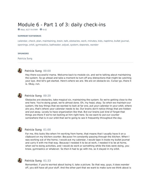 our day is this when it makes sense. A lot of times we're like, oh, you should plan your day, the night before. Well, you know what, my brain is tired after 8pm. And I don't want to plan things sometimes. Patricia Sung 01:54 So on those days where I know, I'm not gonna have the mental capacity for this. And I'm gonna plan to do it at eight o'clock. Find a time in your day, that's earlier, maybe if you're working, you can do it the last few minutes before you leave work, or do it during your lunch break. Maybe you can do your check in every day at naptime while you know, your kids are hopefully quiet for like at least 10 minutes, find it where it's going to fit in your life, the time where you know, okay, this is fairly consistent. And usually things are quieter after lunchtime. Or usually I can take a look at my calendar, when I get my coffee in the morning, find those patterns removed and butted up against something that we already do. Patricia Sung 02:33 We're not trying to create things from scratch, our brain doesn't know what those things when we try to like, although we'd love to do it, throw it all out and start this amazing new plan. We do much better when we adjust, adjust, adjust, adjust, and eventually we end up with a different system. But we've adjusted along the way instead of trying to just throw out you know the baby with the bathwater from the beginning and start from new. So our weekly check in, we have about 15 to 30 minutes. And this depends on like what's going on in your life. Patricia Sung 03:03 If you are a stay at home mom and you have a newborn, you don't have a ton of things on your calendar, like you're at home with the baby, it's not going to take you as long to plan something, then if you have kids with lots of activities that are older, so it's depending on you. And this will get faster, the more that you do it, it will take a lot less time. So when you first start out, it's going to be like, Why this take me so long? Because you don't know how to do it. It's okay. We have to learn. Okay, so we're looking for a time where we have about 15 to 30 minutes, I would say generally it probably takes me about 20 to 30 minutes to plan a week. That's, that's the busier week. We're going to make your plan for the whole week. We're going to check in and be like Oh, um, did I double booked myself? Did I you know, not plan for drive time between here and there. Patricia Sung 03:56 Like this is the time to catch any mistakes or things you just hadn't thought about beforehand. You want to check although that was check it check in is check in with a you know, your spouse or your partner or anyone else that you need to like, talk about this with together, find out like hey, what's going on with you? Can you pick up this drop off time, blah, blah, like this is your time to check in to make sure that everybody's on the same page. And then you want to look