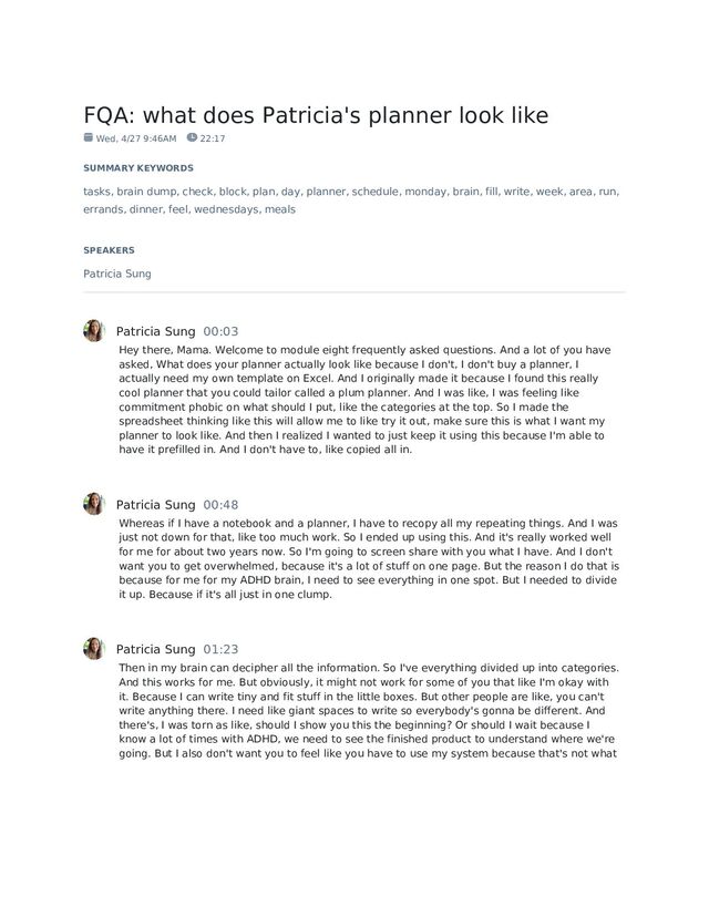 the House things I can get done. And that's one of the things we'll do in our routines classes. Look at like, okay, these kinds of tasks are all similar. How can we do them together? So I think we're running over errands at one time. That means that it's not like, oh, I probably seen the grocery sir. Oh, I need to mail this letter. Oh, I need to get gas in my car. Oh, I forgot to return in this library bookd. Patricia Sung 14:24 But like, if we can say like, on Wednesday, I'm going to do as many errands as possible. Then one things are done and they don't pile up to it like saves you on like timewise because you're out running all the errands in one swoop instead of you know, doing it in a bunch of, you know, a bunch of different times, especially if you live like farther out from stuff like not, you know, to the city. That's a lot more time consuming. And also like it gives you a designated place to do things. So it's like if I'm going to I need to do this errand. I automatically know like, I need to look at Wednesday first, can it be done on Wednesday like these that have to be done before that? Or can it wait till Wednesday. And that makes my, like planning my day easier because I'm not trying to squeeze in. Patricia Sung 15:15 Because I know our brains are like, well, if I don't do it right now, I'm gonna forget to have to do it right now. No, I know, it's okay. Wednesday, it says I needed Aaron say, I will run those errands then. And the good part is that, you know, a lot of the stuff like my am blocks pretty a lot of those tasks are similarly they repeat themselves, my, you know, my AM isn't as variable. Patricia Sung 15:38 And if I need to, like have our schedule changes, I can just move all those tasks for like, getting the house ready. That's why Monday is my like house day, I can just move all the house stuff to another day. If say, like, on Monday, we don't have school, and I know I'm not going to have as much free time, you know, because the kids are going to be home, then I can just say, Okay, well, then I can just like literally like, copy, paste, pull these three tasks for Monday, drop them on to Tuesday. Patricia Sung 16:12 And that makes it you know, easier to, to organize my day, if I know. Like when I kind of prepare for upcoming changes. So this is what I do. The other bonus of having small squares is that I can't write 400 things on there, because it's not possible to get four things done. So if I only have like this, like smidgen amount of space, it's like, well, you know what, I already have to do a load of laundry, drop, oh, I'm not dropping off anyone. Preschool now, but drop for school. And work on podcast stuff. It's like, well, I already have a full morning there, I can't really fit in any more stuff. Patricia Sung 17:03