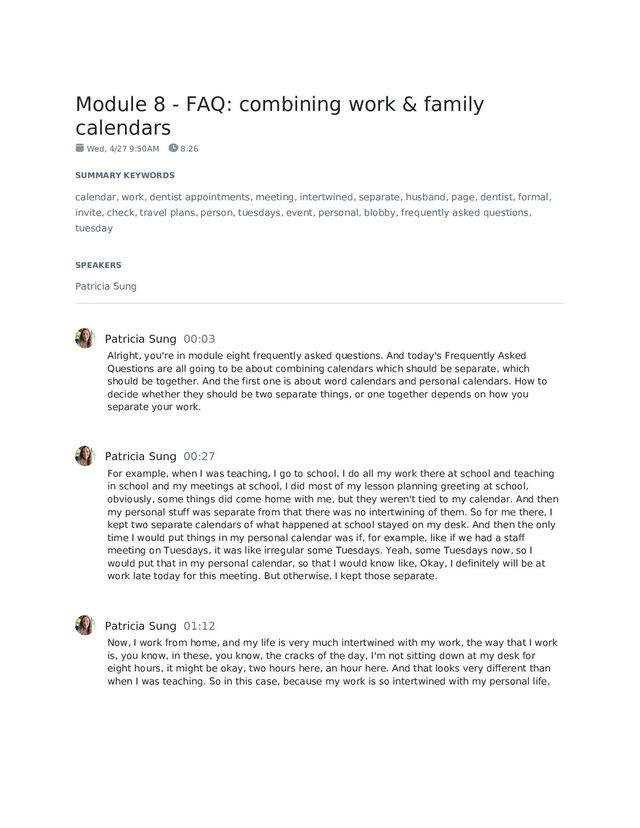 4/27 9:50AM 8:26 SUMMARY KEYWORDS calendar, work, dentist appointments, meeting, intertwined, separate, husband, page, dentist, formal, invite, check, travel plans, person, tuesdays, event, personal, blobby, frequently asked questions, tuesday SPEAKERS Patricia Sung Patricia Sung 00:03 Alright, you're in module eight frequently asked questions. And today's Frequently Asked Questions are all going to be about combining calendars which should be separate, which should be together. And the first one is about word calendars and personal calendars. How to decide whether they should be two separate things, or one together depends on how you separate your work. Patricia Sung 00:27 For example, when I was teaching, I go to school, I do all my work there at school and teaching in school and my meetings at school, I did most of my lesson planning greeting at school, obviously, some things did come home with me, but they weren't tied to my calendar. And then my personal stuff was separate from that there was no intertwining of them. So for me there, I kept two separate calendars of what happened at school stayed on my desk. And then the only time I would put things in my personal calendar was if, for example, like if we had a staff meeting on Tuesdays, it was like irregular some Tuesdays. Yeah, some Tuesdays now, so I would put that in my personal calendar, so that I would know like, Okay, I definitely will be at work late today for this meeting. But otherwise, I kept those separate. Patricia Sung 01:12 Now, I work from home, and my life is very much intertwined with my work, the way that I work is, you know, in these, you know, the cracks of the day, I'm not sitting down at my desk for eight hours, it might be okay, two hours here, an hour here. And that looks very different than when I was teaching. So in this case, because my work is so intertwined with my personal life,