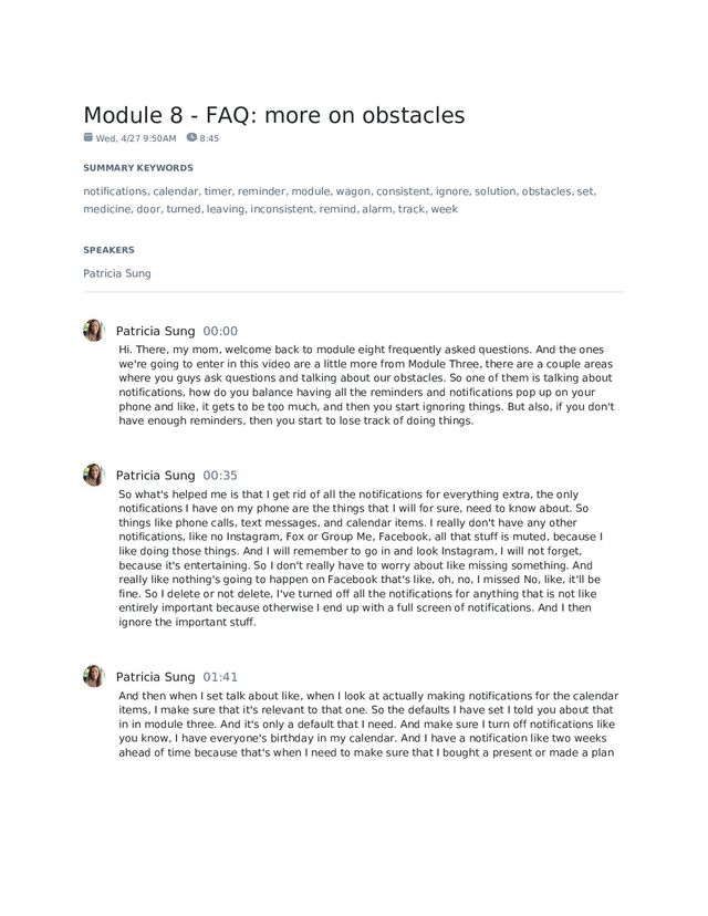 ourselves up for not doing something when like, that's not how our brain is built, it's never going to happen that way, we are not going to be consistent. So let's let that go. And instead, we're going to focus our energy on like, how am I going to overcome being inconsistent? And where like, what am I going to do to set myself up for success? Patricia Sung 05:38 So one of the ways I know that I'm getting off track is because I turned into a hot mess. That's a trigger for like, Oh, hey, I am running around like a chicken, my head cut off because I wasn't looking at my calendar is getting overwhelmed. I didn't know a plan for the day like that brings me around. I'm like, okay, that's my why that's my motivation, I need to go back to my why, and remind myself, this is why I'm doing this. So when I fall off the wagon, if the ground that's it reminds me, when I, you know, remind myself, this is why I'm doing this, that will help me come back around. And then think about, you know, the whole point of Module three is, what is it that you need to overcome your obstacles? If this is one for you? It's where's your accountability? Do you have it written somewhere that you're going? Like, are you leaving it out so that you can see it? Is it a visual thing? Are you bundling it with something you're already doing? Or were you trying to reinvent the wheel and make it extra hard? bundle it with something that you're gonna do every day. Patricia Sung 06:41 So you know, if you drink coffee every morning, put the calendar next to the coffee pot, because you're gonna see it in the morning when you wake up. If you'd have, like, you know, if you'd have a roommate or a partner or spouse, best friend, and somebody who will be there to help you when they see, you know, you're falling off the wagon, or they noticed that you you know, you made an appointment and you didn't write down they'd be like, Hey, where's your shoulder? In a way that's not going to make you angry? Cuz RSD and all that good stuff. So think about it for you. What are the ways that you know you're going to get off track? And what are the things you're going to plan for ahead of time to get back on track because we are going to be getting consistent, we are going to fall off the wagon, we're gonna we're gonna forget. Patricia Sung 07:30 Our job is to be creative planning, creative problem solvers ahead of time, and come up with whatever many ways that you have solutions for that and you're gonna try them out and it's like, okay, well, when my husband reminded me, it just made me irritated. So that's not a good solution. Let me try. Next one. Okay, leaving it out on the calendar because they see it first in the morning. That's helpful. Patricia Sung 07:59 Maybe having a post it note on your sink that says did you look at your calendar for tomorrow? Use that when you start to ignore that post it note, put it on the shower door, or put it on the bathroom door, move it around so that you'll see it there's plenty of good reminder queues out