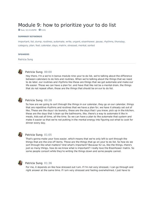 5/1 8:45PM 5:01 SUMMARY KEYWORDS important, list, dump, routines, automate, write, urgent, eisenhower, pause, rhythms, thursday, category, plan, feel, calendar, days, matrix, stressed, mental, sorted SPEAKERS Patricia Sung Patricia Sung 00:00 Hey there, I'm a we're in bonus module nine your to do list, we're talking about the difference between calendars to do lists and routines. When we're talking about the things that we need to do later, our routines and rhythms like these are things that we get automate and make our life easier. Those we can have a plan for, and have that like not be a mental drain, the things that do not repeat often, those are the things that should be on our to do list. Patricia Sung 00:28 So how are we going to sort through the things in our calendar, they go on our calendar, things that are repetitive rhythms and routines that we have a plan for, we have it already set out of like, These are the days I do laundry, these are the days that I you know, pick up in the kitchen, these are the days that I clean up the bathrooms, like, there's a way to automate it like in meals, kids eat all time, all the time. So we can have a plan to like automate that system and make it easier so that we're not putting in the mental energy into figuring out what to cook for dinner every day. Patricia Sung 01:05 That's gonna make your lives easier, which means that we're only left to sort through the things that are the one off items. Those are the things that go on your to do list. So how do we sort through like what matters? And what's important? Because for us, like the things, there's just so many things, how do we know what is important? I really love the Eisenhower matrix. So some people consort while they're writing the things down and some people cannot. Patricia Sung 01:36 For me, it depends on like how stressed out I am. If I'm not very stressed, I can go through and right answer at the same time. If I am very stressed and feeling overwhelmed, I just have to
