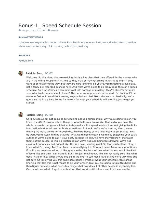 SUMMARY KEYWORDS schedule, non negotiables, hours, minute, kids, bedtime, predetermined, work, divider, sketch, section, whiteboard, write, today, pick, morning, school, pm, feel, day SPEAKERS Patricia Sung Patricia Sung 00:02 Welcome. So this video that we're doing this is a live class that they offered for the mamas who are in the White House to sit in. And so they may or may not chime in, it's up to them if they want to or not along the way, but they are here listening. So you're, you're getting a live class, not a fancy pre recorded busness here. And what we're going to do today is go through a speed schedule. So a lot of times when moms get into damage or mastery, they're like, I'm not quite sure what to do, where should I start? This, what we're gonna do in the next, I'm hoping it'll be move as fast as I can without leaving anyone behind. And like under an hour, basically, we're gonna set up like a bare bones framework for what your schedule will look like, just to get you started. Patricia Sung 00:50 So like, today, I am not going to be teaching about a bunch of like, why we're doing this or, you know, the ADHD reason behind things or what helps our brains like, that's why you have the whole course is that gives all that so today really is like speed version. I am not giving like Boku information hurt small teacher hurts sometimes. But look, we're we're tracking them, we're moving. So we're gonna go through the, like bare bones of what you need to get started. But I do want you to keep in mind that like, what we're doing today is we're like sketching your basic outline of we're going to call it your boat, because it's like, we have the you know, the water theme of the course, is this is a sketch, it's an we're not sure being this drawing, we're not carving it out of clay and firing it like, this is a basic starting point. So that you feel like, okay, I know what I'm doing. And from here, I am modifying it to fit what I need. Because a lot of times if he like we need some kind of like, give me the like, let me know what the end result like kind of looks like and then I can make it. But if I'm just moving out, like, I'm not really sure like, what does this look like? What should this be at the end? It can feel a little bit like more unwieldy and not sure. So I'm giving you this basic bare bones version of what your schedule can start as knowing that like this is not meant to be your forever deal. You are going to take this basic and then figure out okay, what needs to change what how does it fit other people in my family like, Ooh, you know what I forgot to write down that my kids still takes a nap like these are the