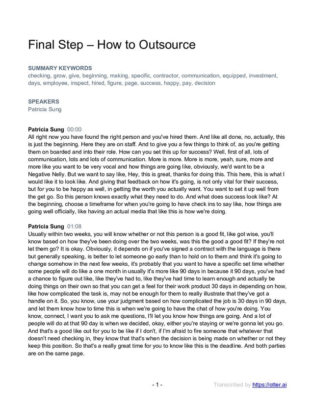 to Outsource SUMMARY KEYWORDS checking, grow, give, beginning, making, specific, contractor, communication, equipped, investment, days, employee, inspect, hired, figure, page, success, happy, pay, decision SPEAKERS Patricia Sung Patricia Sung 00:00 All right now you have found the right person and you've hired them. And like all done, no, actually, this is just the beginning. Here they are on staff. And to give you a few things to think of, as you're getting them on boarded and into their role. How can you set this up for success? Well, first of all, lots of communication, lots and lots of communication. More is more. More is more, yeah, sure, more and more like you want to be very vocal and how things are going like, obviously, we'd want to be a Negative Nelly. But we want to say like, Hey, this is great, thanks for doing this. This here, this is what I would like it to look like. And giving that feedback on how it's going, is not only vital for their success, but for you to be happy as well, in getting the worth you actually want. You want to set it up well from the get go. So this person knows exactly what they need to do. And what does success look like? At the beginning, choose a timeframe for when you're going to have check ins to say like, how things are going well officially, like having an actual media that like this is how we're doing. Patricia Sung 01:08 Usually within two weeks, you will know whether or not this person is a good fit, like got wise, you'll know based on how they've been doing over the two weeks, was this the good a good fit? If they're not let them go? It is okay. Obviously, it depends on if you've signed a contract with the language is there but generally speaking, is better to let someone go early than to hold on to them and think it's going to change somehow in the next few weeks, it's probably that you want to have a specific set time whether some people will do like a one month in usually it's more like 90 days in because it 90 days, you've had a chance to figure out like, like they've had to, like they've had time to learn enough and actually be doing things on their own so that you can get a feel for their work product 30 days in depending on how, like how complicated the task is, may not be enough for them to really illustrate that they've got a handle on it. So, you know, use your judgment based on how complicated the job is 30 days in 90 days, and let them know how to time this is when we're going to have the chat of how you're doing. You know, connect, I want you to ask me questions, I'll let you know how things are going. And a lot of people will do at that 90 day is when we decided, okay, either you're staying or we're gonna let you go. And that's a good like out for you to be like if I don't, if I'm afraid to fire someone that whatever that doesn't need checking in, they know that that's when the decision is being made on whether or not they keep this position. So that's a really great time for you to know like this is the deadline. And both parties are on the same page.