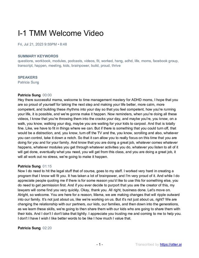 Fri, Jul 21, 2023 9:55PM • 8:48 SUMMARY KEYWORDS questions, workbook, modules, podcasts, videos, fit, worked, hang, adhd, life, moms, facebook group, transcript, happen, meeting, kids, brainpower, build, proud, thrive SPEAKERS Patricia Sung Patricia Sung 00:00 Hey there successful mama, welcome to time management mastery for ADHD moms, I hope that you are so proud of yourself for taking the next step and making your life better, more calm, more competent, and building these rhythms into your day so that you feel competent, how you're running your life, it is possible, and we're gonna make it happen. Now reminders, when you're doing all these videos, I know that you're throwing them into the cracks your day, and maybe you're, you know, on a walk, you know, walking your dog, maybe you are waiting for your kids to carpool. And that is totally fine. Like, we have to fit in things where we can. But if there is something that you could turn off, that would be a distraction, and, you know, turn off the TV and the, you know, scrolling and also, whatever you can control, take it down a notch. So that it can allow you to really focus on this time that you are doing for you and for your family. And know that you are doing a great job, whatever comes whatever happens, whatever modules you get through whatever activities you do, whatever you listen to all of it will get done, eventually what you need, you will get from this class, and you are doing a great job, it will all work out no stress, we're going to make it happen. Patricia Sung 01:15 Now I do need to hit the legal stuff that of course, goes to my staff. I worked very hard in creating a program that I know will fit you. It has taken a lot of brainpower, and I'm very proud of it. And while I do appreciate people quoting me if there is for some reason you'd like to use this for something else, you do need to get permission first. And if you ever decide to purport that you are the creator of this, my lawyers will come find you very quickly. Okay, thank you. All right, business done. Let's move on. Alright, so welcome. You are here for a reason, Mama, we are making changes that will ripple outward into our family. It's not just about us, like we're working on us. But it's not just about us, right? We are changing the relationship with our partners, our kids, our families, and then down into the generations, as we learn these skills, we're going to then share them with our kids who are going to share them with their kids. And I don't I don't take that lightly. I appreciate you trusting me and coming to me to help you. I don't I have I wish I like better words to be like I how much I value that. Patricia Sung 02:20
