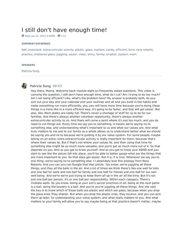 3:09PM 7:21 SUMMARY KEYWORDS ball, important, extracurricular activity, plastic, glass, matters, sanity, efficient, tend, nora roberts, practice, shattered glass, juggling, easier, video, shiny, family, emptier, system, mom SPEAKERS Patricia Sung Patricia Sung 00:03 Hey there, Mama. Welcome back module eight on frequently asked questions. This video is carrying the question, I still don't have enough time, what do I cut? Am I trying to do too much? Am I not being efficient? Like, what's the problem here? My answer is probably both. As you sort out your day and your calendar and your routines and all and you build in the habits and make everything run more efficiently, yes, you will have more time because you're doing those things in a more like in a more efficient way, it's going to be faster, and that will get easier. But also, like, Mom plates are really full. There's never a shortage of stuff for us to do for our families. And there's always another volunteer opportunity, there's always another extracurricular activity to do. And there will come a point where it's just too much, and you do need to cut things out. Every time we say yes to something, it means we're saying no to something else, and understanding what's important to us and what our values are. And what truly matters to me and to our family as a whole allows us to understand better what we should be saying yes and no to because we're guiding it by our value system. For some people, maybe taking on an extra, extra extracurricular activity is really important for them, because that's where their values lie. But if that's not where your values lie, and then using that time for something else might be so much more valuable, and you'd get so much more out of it. So that depends on you. And as you get to know yourself. And as you get to know your ADHD and you start to see like the pieces fall into place, you'll be able to better gauge what are the things that are more important to you. So that does get easier. But it is, it is true. Whenever we say yes to one thing, we're saying no to something else. I I absolutely love this analogy from Nora Roberts. And you can you can Google that that article. You know, we're juggling all these things, and they all the balls in the air. And a lot of times we think there's like one wall for kids and one ball for work and one ball for family and one ball for friends and one ball for our own well being. And we're we're just trying to keep them all up in the air all the time. But it's not just one ball per person, it's or one ball per responsibility. Within each category. There's multiple walls. So you know, being at your son's soccer practices of all, being at the next game is a ball, doing the laundry is a ball. And you're you're juggling all these things. And she said the key is to know which of those balls are plastic and which are glass, because when you drop the glass ones They shatter. But when you drop the plastic ones, they bounce, and you can pick them up later. So understanding your value system, and what really matters to you. And what matters to your family will allow you to say maybe being at that practice doesn't matter, maybe