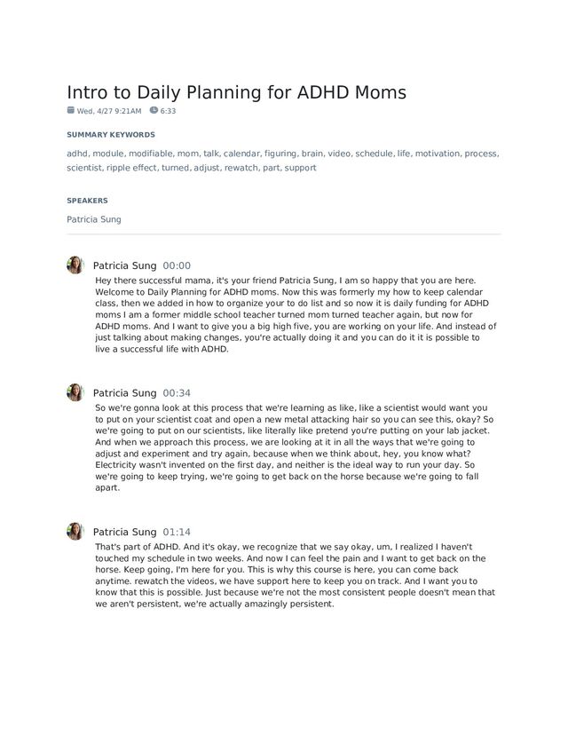 6:33 SUMMARY KEYWORDS adhd, module, modifiable, mom, talk, calendar, figuring, brain, video, schedule, life, motivation, process, scientist, ripple effect, turned, adjust, rewatch, part, support SPEAKERS Patricia Sung Patricia Sung 00:00 Hey there successful mama, it's your friend Patricia Sung, I am so happy that you are here. Welcome to Daily Planning for ADHD moms. Now this was formerly my how to keep calendar class, then we added in how to organize your to do list and so now it is daily funding for ADHD moms I am a former middle school teacher turned mom turned teacher again, but now for ADHD moms. And I want to give you a big high five, you are working on your life. And instead of just talking about making changes, you're actually doing it and you can do it it is possible to live a successful life with ADHD. Patricia Sung 00:34 So we're gonna look at this process that we're learning as like, like a scientist would want you to put on your scientist coat and open a new metal attacking hair so you can see this, okay? So we're going to put on our scientists, like literally like pretend you're putting on your lab jacket. And when we approach this process, we are looking at it in all the ways that we're going to adjust and experiment and try again, because when we think about, hey, you know what? Electricity wasn't invented on the first day, and neither is the ideal way to run your day. So we're going to keep trying, we're going to get back on the horse because we're going to fall apart. Patricia Sung 01:14 That's part of ADHD. And it's okay, we recognize that we say okay, um, I realized I haven't touched my schedule in two weeks. And now I can feel the pain and I want to get back on the horse. Keep going, I'm here for you. This is why this course is here, you can come back anytime. rewatch the videos, we have support here to keep you on track. And I want you to know that this is possible. Just because we're not the most consistent people doesn't mean that we aren't persistent, we're actually amazingly persistent.