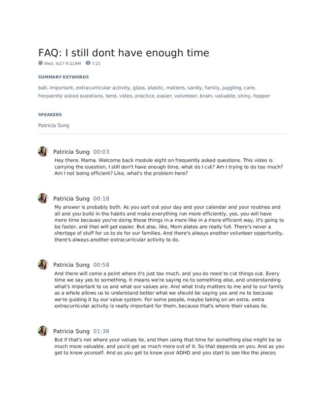 7:21 SUMMARY KEYWORDS ball, important, extracurricular activity, glass, plastic, matters, sanity, family, juggling, care, frequently asked questions, tend, video, practice, easier, volunteer, brain, valuable, shiny, hopper SPEAKERS Patricia Sung Patricia Sung 00:03 Hey there, Mama. Welcome back module eight on frequently asked questions. This video is carrying the question, I still don't have enough time, what do I cut? Am I trying to do too much? Am I not being efficient? Like, what's the problem here? Patricia Sung 00:18 My answer is probably both. As you sort out your day and your calendar and your routines and all and you build in the habits and make everything run more efficiently, yes, you will have more time because you're doing those things in a more like in a more efficient way, it's going to be faster, and that will get easier. But also, like, Mom plates are really full. There's never a shortage of stuff for us to do for our families. And there's always another volunteer opportunity, there's always another extracurricular activity to do. Patricia Sung 00:58 And there will come a point where it's just too much, and you do need to cut things out. Every time we say yes to something, it means we're saying no to something else, and understanding what's important to us and what our values are. And what truly matters to me and to our family as a whole allows us to understand better what we should be saying yes and no to because we're guiding it by our value system. For some people, maybe taking on an extra, extra extracurricular activity is really important for them, because that's where their values lie. Patricia Sung 01:39 But if that's not where your values lie, and then using that time for something else might be so much more valuable, and you'd get so much more out of it. So that depends on you. And as you get to know yourself. And as you get to know your ADHD and you start to see like the pieces