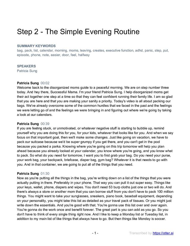 Simple Evening Routine SUMMARY KEYWORDS bag, pack, list, calendar, morning, moms, leaving, creates, executive function, adhd, panic, step, put, episode, phone, note, easier, door, feel, halfway SPEAKERS Patricia Sung Patricia Sung 00:02 Welcome back to the disorganized moms guide to a peaceful morning. We are on step number three today. And hey there, Successful Mama. I'm your friend Patricia Sung. I help disorganized moms get their act together one step at a time so that they can feel confident running their family life. I am so glad that you are here and that you are making your sanity a priority. Today's video is all about packing our bags. We've already overcome some of the common hurdles that we faced in the past and the feelings we were letting go of and the feelings we were bringing in and figuring out where we're going by taking a look at our calendars. Patricia Sung 00:39 If you are feeling stuck, or unmotivated, or whatever negative stuff is starting to bubble up, remind yourself why you are doing this for you, for your kids, whatever that looks like for you. And when we say focus on that important goal, then we'll make some changes. Just like going on vacation, we have to pack our suitcase because we'd be super grumpy if you get there, and you can't get in the pool because you packed a parka. Knowing where you're going on this trip tomorrow will help you plan ahead because you already looked at your calendar, you know where you're going, and you know what to pack. So what do you need for tomorrow, I want you to first grab your bag. Do you need your purse, your work bag, your backpack, briefcase, diaper bag, gym bag? Whatever it is that needs to go with you. And in that container, we are going to put all of the things that you need. Patricia Sung 01:30 Now as you're putting all the things in the bag, you're writing down on a list of the things that you were actually putting in there. Preferably in your phone. That way you can pull it out super easy. Things like your keys, wallet, phone, diapers and wipes. You don't need 53 burp cloths just one or two will do. And there's always a store or another mom that you can borrow stuff from you don't have to pack 100 million things. You might want to take your sunglasses, sneakers, piano book, baseball equipment, depending on your personality, you might take this list as detailed as your travel pack of tissues. Or you might just write down the essentials. And you're good with that. You're gonna use this list over and over again. You're gonna do the work once and benefit forever. The great part is you can add as you go. So you don't have to think of every single thing right now. And I like to keep a Monday list or Tuesday list, in addition to my main list of like things that always have to go. But then things like Monday is soccer.