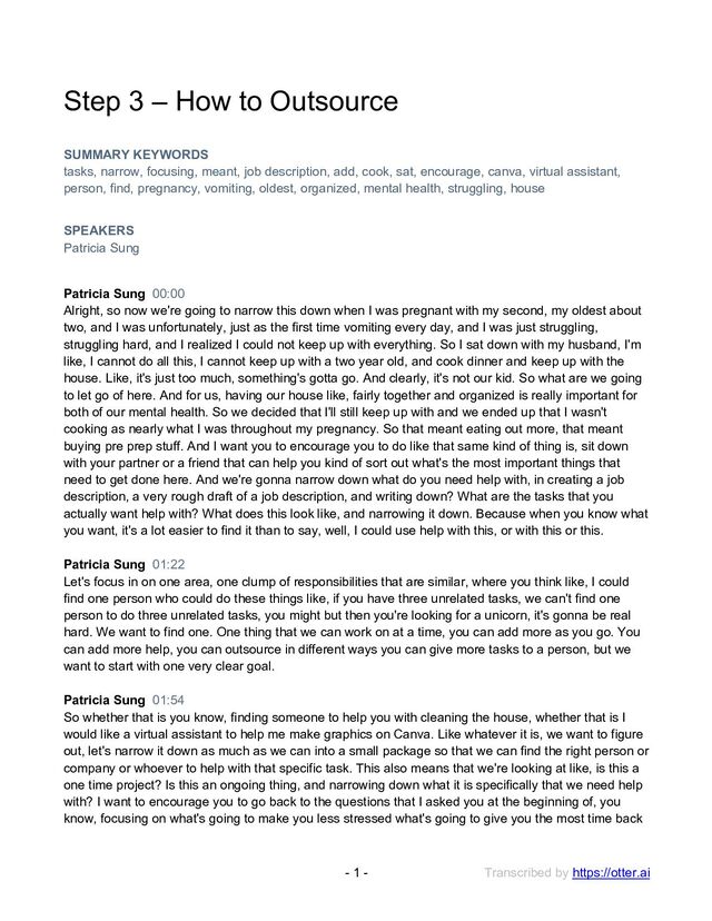 to Outsource SUMMARY KEYWORDS tasks, narrow, focusing, meant, job description, add, cook, sat, encourage, canva, virtual assistant, person, find, pregnancy, vomiting, oldest, organized, mental health, struggling, house SPEAKERS Patricia Sung Patricia Sung 00:00 Alright, so now we're going to narrow this down when I was pregnant with my second, my oldest about two, and I was unfortunately, just as the first time vomiting every day, and I was just struggling, struggling hard, and I realized I could not keep up with everything. So I sat down with my husband, I'm like, I cannot do all this, I cannot keep up with a two year old, and cook dinner and keep up with the house. Like, it's just too much, something's gotta go. And clearly, it's not our kid. So what are we going to let go of here. And for us, having our house like, fairly together and organized is really important for both of our mental health. So we decided that I'll still keep up with and we ended up that I wasn't cooking as nearly what I was throughout my pregnancy. So that meant eating out more, that meant buying pre prep stuff. And I want you to encourage you to do like that same kind of thing is, sit down with your partner or a friend that can help you kind of sort out what's the most important things that need to get done here. And we're gonna narrow down what do you need help with, in creating a job description, a very rough draft of a job description, and writing down? What are the tasks that you actually want help with? What does this look like, and narrowing it down. Because when you know what you want, it's a lot easier to find it than to say, well, I could use help with this, or with this or this. Patricia Sung 01:22 Let's focus in on one area, one clump of responsibilities that are similar, where you think like, I could find one person who could do these things like, if you have three unrelated tasks, we can't find one person to do three unrelated tasks, you might but then you're looking for a unicorn, it's gonna be real hard. We want to find one. One thing that we can work on at a time, you can add more as you go. You can add more help, you can outsource in different ways you can give more tasks to a person, but we want to start with one very clear goal. Patricia Sung 01:54 So whether that is you know, finding someone to help you with cleaning the house, whether that is I would like a virtual assistant to help me make graphics on Canva. Like whatever it is, we want to figure out, let's narrow it down as much as we can into a small package so that we can find the right person or company or whoever to help with that specific task. This also means that we're looking at like, is this a one time project? Is this an ongoing thing, and narrowing down what it is specifically that we need help with? I want to encourage you to go back to the questions that I asked you at the beginning of, you know, focusing on what's going to make you less stressed what's going to give you the most time back
