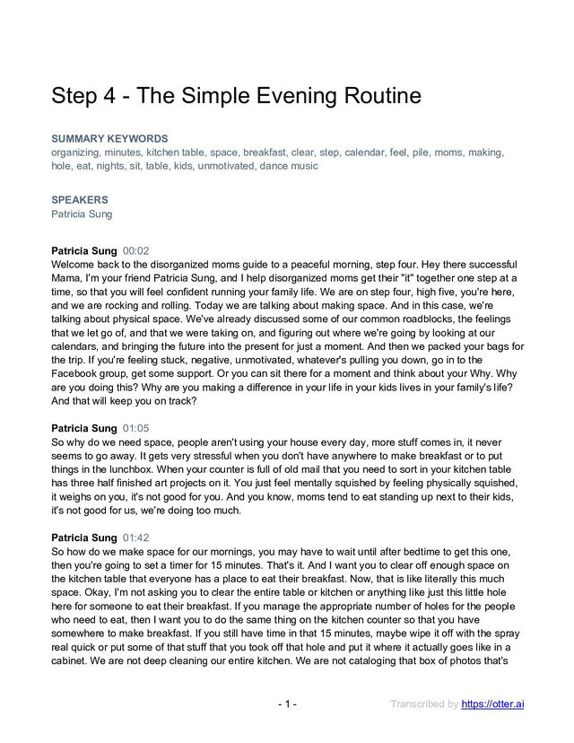 Simple Evening Routine SUMMARY KEYWORDS organizing, minutes, kitchen table, space, breakfast, clear, step, calendar, feel, pile, moms, making, hole, eat, nights, sit, table, kids, unmotivated, dance music SPEAKERS Patricia Sung Patricia Sung 00:02 Welcome back to the disorganized moms guide to a peaceful morning, step four. Hey there successful Mama, I'm your friend Patricia Sung, and I help disorganized moms get their "it" together one step at a time, so that you will feel confident running your family life. We are on step four, high five, you're here, and we are rocking and rolling. Today we are talking about making space. And in this case, we're talking about physical space. We've already discussed some of our common roadblocks, the feelings that we let go of, and that we were taking on, and figuring out where we're going by looking at our calendars, and bringing the future into the present for just a moment. And then we packed your bags for the trip. If you're feeling stuck, negative, unmotivated, whatever's pulling you down, go in to the Facebook group, get some support. Or you can sit there for a moment and think about your Why. Why are you doing this? Why are you making a difference in your life in your kids lives in your family's life? And that will keep you on track? Patricia Sung 01:05 So why do we need space, people aren't using your house every day, more stuff comes in, it never seems to go away. It gets very stressful when you don't have anywhere to make breakfast or to put things in the lunchbox. When your counter is full of old mail that you need to sort in your kitchen table has three half finished art projects on it. You just feel mentally squished by feeling physically squished, it weighs on you, it's not good for you. And you know, moms tend to eat standing up next to their kids, it's not good for us, we're doing too much. Patricia Sung 01:42 So how do we make space for our mornings, you may have to wait until after bedtime to get this one, then you're going to set a timer for 15 minutes. That's it. And I want you to clear off enough space on the kitchen table that everyone has a place to eat their breakfast. Now, that is like literally this much space. Okay, I'm not asking you to clear the entire table or kitchen or anything like just this little hole here for someone to eat their breakfast. If you manage the appropriate number of holes for the people who need to eat, then I want you to do the same thing on the kitchen counter so that you have somewhere to make breakfast. If you still have time in that 15 minutes, maybe wipe it off with the spray real quick or put some of that stuff that you took off that hole and put it where it actually goes like in a cabinet. We are not deep cleaning our entire kitchen. We are not cataloging that box of photos that's