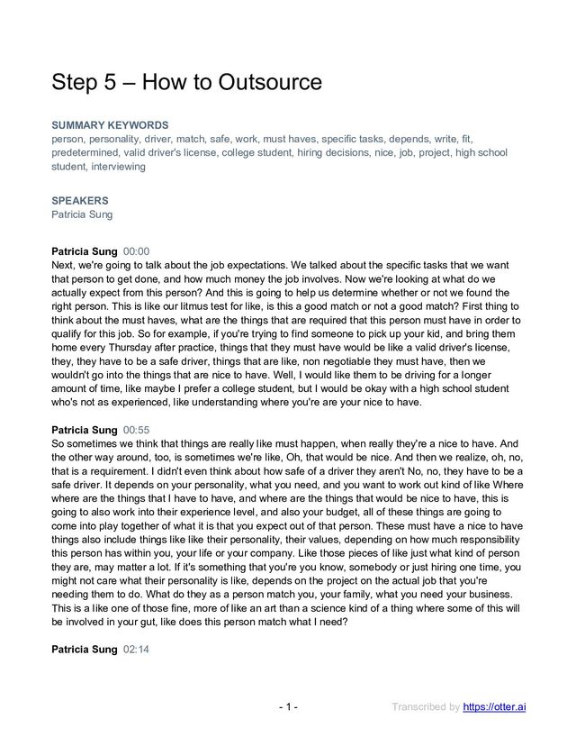 to Outsource SUMMARY KEYWORDS person, personality, driver, match, safe, work, must haves, specific tasks, depends, write, fit, predetermined, valid driver's license, college student, hiring decisions, nice, job, project, high school student, interviewing SPEAKERS Patricia Sung Patricia Sung 00:00 Next, we're going to talk about the job expectations. We talked about the specific tasks that we want that person to get done, and how much money the job involves. Now we're looking at what do we actually expect from this person? And this is going to help us determine whether or not we found the right person. This is like our litmus test for like, is this a good match or not a good match? First thing to think about the must haves, what are the things that are required that this person must have in order to qualify for this job. So for example, if you're trying to find someone to pick up your kid, and bring them home every Thursday after practice, things that they must have would be like a valid driver's license, they, they have to be a safe driver, things that are like, non negotiable they must have, then we wouldn't go into the things that are nice to have. Well, I would like them to be driving for a longer amount of time, like maybe I prefer a college student, but I would be okay with a high school student who's not as experienced, like understanding where you're are your nice to have. Patricia Sung 00:55 So sometimes we think that things are really like must happen, when really they're a nice to have. And the other way around, too, is sometimes we're like, Oh, that would be nice. And then we realize, oh, no, that is a requirement. I didn't even think about how safe of a driver they aren't No, no, they have to be a safe driver. It depends on your personality, what you need, and you want to work out kind of like Where where are the things that I have to have, and where are the things that would be nice to have, this is going to also work into their experience level, and also your budget, all of these things are going to come into play together of what it is that you expect out of that person. These must have a nice to have things also include things like like their personality, their values, depending on how much responsibility this person has within you, your life or your company. Like those pieces of like just what kind of person they are, may matter a lot. If it's something that you're you know, somebody or just hiring one time, you might not care what their personality is like, depends on the project on the actual job that you're needing them to do. What do they as a person match you, your family, what you need your business. This is a like one of those fine, more of like an art than a science kind of a thing where some of this will be involved in your gut, like does this person match what I need? Patricia Sung 02:14