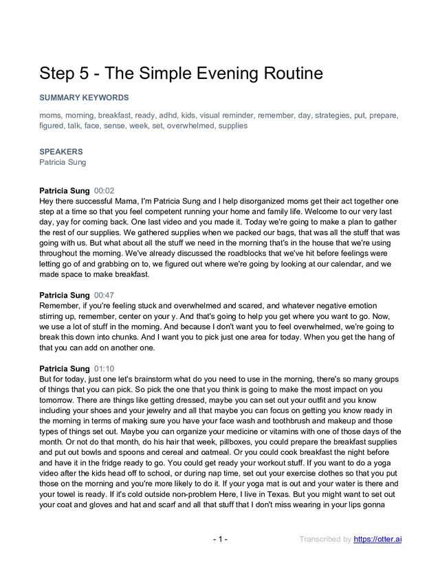 we've got that part down. So you hear jokes about it. Like we struggle with this concept. We don't actually struggle with the permanence of objects. But we do struggle with remembering things that we can't see. Now you'll see this in little ways. Like we buy fruit, we send it in the fridge door, which I call the fruit coffin. And then we don't remember it until it's already gross and moldy. And it's truly deeded. We also can see this in big things like in a relationship where we're not around our partner, and they're like, Hey, why haven't you texted me? Why haven't you checked on me. And it's just when things are in our face, we remember them, we see them. It's a visual reminder. And when we don't see the stuff that visual minor, and we're not as aware of those things. So we want to use this concept to our advantage, instead of the other ways that we struggle with it. How can we use that to our advantage? How do we put things out where we will easily remember them? How can we put our things by the door? So we take them with us? How do we have those visual reminders to add a day to help us make sense, help us remind ourselves all those ways that we can use that to our advantage and to help us now this is just one piece of the puzzle. Patricia Sung 07:33 When you have prepared the night before to make a really calm morning, everything's flow is smooth as it gets around. That's just one piece of your day getting set up to make sense for you and your family. When we have ADHD, a lot of times it feels like our days just happening to us it feels out of control. And it doesn't feel like we've chosen the way that we want our day to go. It's just happening. And it doesn't have to feel like that when you have the skills and the strategies in place to talk to you in a way that makes sense for your brain, then you can make sense of your day, you can have a plan that fits you, you can feel competent about your day, you can have space to have meaningful conversations with your kids, you can have space for rest, and fun and hobbies, get all the boring stuff done that nobody wants to do. But we still have to do because our moms want to do other things. And you can have the kind of day that you want so that by the time you get to the end of the night, you're not overwhelmed and frustrated and taking it out on everyone else. Sprinkle experience. Patricia Sung 08:27 Okay, so it is possible to do that. And the reason I know this is because I figured it out. Am I perfect? No. But I figured out a way to run my day so that I feel good about it, I get done the things I want to do. And it makes sense for my family. And I've been teaching mom after mom after mom how to do this. And it works, you can learn these strategies for you. And the beautiful thing is that once you've learned these strategies, like an figured them out for you, you can keep using them, it's not a one time deal, you recycle them every time your seasons change, and your kids grow, you have the strategies you need to make it all work. And then as a mom, you can then teach your kids these strategies because a lot of times when we have ADHD so to our kids, and we can then teach them how to set up their day that makes sense for them, and be able to create your own structure when you need it. And yet still have fun and not be stifled by this plan. Because it's very fluid. It's very movable. It's very like flexible, you make it fit you because we all know something's gonna vomit. And then you're gonna have to reduce that write, redo the schedule everything around. In this case, you know, the easy way to fix it so that tomorrow, you can still get those things done or two days from now, you know how to make it make sense for you. Now, if all this hits home for you, I want to invite you and say please come join us in time management mastery for ADHD moms. It's an 11 week program where we walk through how do you put all the pieces of your life together and make a rhythm to your day that makes sense for you and it's