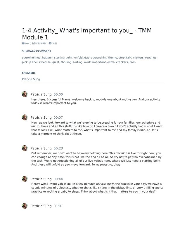 Mon, 2/28 4:48PM 3:25 SUMMARY KEYWORDS overwhelmed, happen, starting point, unfold, day, overarching theme, stop, talk, matters, routines, pickup line, schedule, quiet, thrilling, sorting, work, important, extra, crackers, bam SPEAKERS Patricia Sung Patricia Sung 00:00 Hey there, Successful Mama, welcome back to module one about motivation. And our activity today is what's important to you. Patricia Sung 00:07 Now, as we look forward to what we're going to be creating for our families, our schedule and our routines and all this stuff, it's like how do I create a plan if I don't actually know what I want that to look like. What matters to me, what's important to me and my family is like, oh, let's take a moment to think about those. Patricia Sung 00:23 But remember, we don't want to be overwhelming here. This decision is like for right now, you can change at any time, this is not like the end all be all. So try not to get too overwhelmed by the task. We're not questioning all of our live values here, where we just need a starting point. And these will unfold as you move forward. So no pressure, okay. Patricia Sung 00:44 Here's what I want you to do. In a few minutes of, you know, the cracks in your day, we have a couple minutes of quietness, whether that's like sitting in the pickup line, or very thrilling sports practice or rocking a baby to sleep. Think about what is it that matters to you in your day? Patricia Sung 01:01