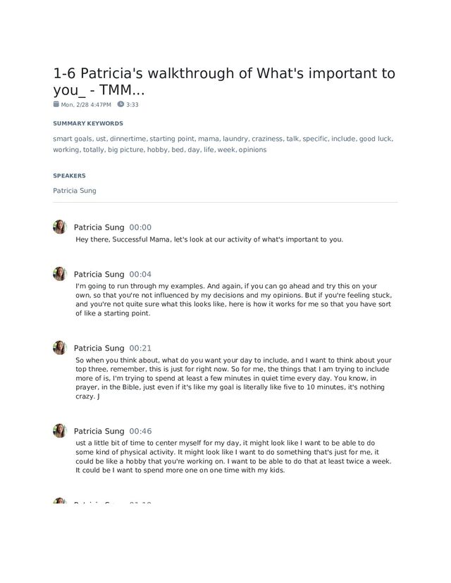 Mon, 2/28 4:47PM 3:33 SUMMARY KEYWORDS smart goals, ust, dinnertime, starting point, mama, laundry, craziness, talk, specific, include, good luck, working, totally, big picture, hobby, bed, day, life, week, opinions SPEAKERS Patricia Sung Patricia Sung 00:00 Hey there, Successful Mama, let's look at our activity of what's important to you. Patricia Sung 00:04 I'm going to run through my examples. And again, if you can go ahead and try this on your own, so that you're not influenced by my decisions and my opinions. But if you're feeling stuck, and you're not quite sure what this looks like, here is how it works for me so that you have sort of like a starting point. Patricia Sung 00:21 So when you think about, what do you want your day to include, and I want to think about your top three, remember, this is just for right now. So for me, the things that I am trying to include more of is, I'm trying to spend at least a few minutes in quiet time every day. You know, in prayer, in the Bible, just even if it's like my goal is literally like five to 10 minutes, it's nothing crazy. J Patricia Sung 00:46 ust a little bit of time to center myself for my day, it might look like I want to be able to do some kind of physical activity. It might look like I want to do something that's just for me, it could be like a hobby that you're working on. I want to be able to do that at least twice a week. It could be I want to spend more one on one time with my kids. Patricia Sung 01:10