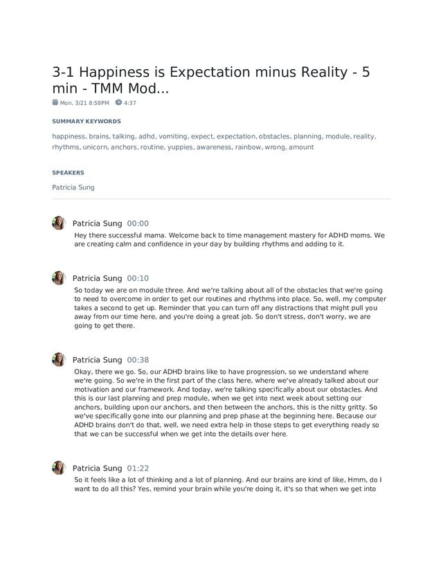 TMM Mod... Mon, 3/21 8:58PM 4:37 SUMMARY KEYWORDS happiness, brains, talking, adhd, vomiting, expect, expectation, obstacles, planning, module, reality, rhythms, unicorn, anchors, routine, yuppies, awareness, rainbow, wrong, amount SPEAKERS Patricia Sung Patricia Sung 00:00 Hey there successful mama. Welcome back to time management mastery for ADHD moms. We are creating calm and confidence in your day by building rhythms and adding to it. Patricia Sung 00:10 So today we are on module three. And we're talking about all of the obstacles that we're going to need to overcome in order to get our routines and rhythms into place. So, well, my computer takes a second to get up. Reminder that you can turn off any distractions that might pull you away from our time here, and you're doing a great job. So don't stress, don't worry, we are going to get there. Patricia Sung 00:38 Okay, there we go. So, our ADHD brains like to have progression, so we understand where we're going. So we're in the first part of the class here, where we've already talked about our motivation and our framework. And today, we're talking specifically about our obstacles. And this is our last planning and prep module, when we get into next week about setting our anchors, building upon our anchors, and then between the anchors, this is the nitty gritty. So we've specifically gone into our planning and prep phase at the beginning here. Because our ADHD brains don't do that, well, we need extra help in those steps to get everything ready so that we can be successful when we get into the details over here. Patricia Sung 01:22 So it feels like a lot of thinking and a lot of planning. And our brains are kind of like, Hmm, do I want to do all this? Yes, remind your brain while you're doing it, it's so that when we get into the details, we're prepared. And we're not scrambling trying to sort out solutions for something