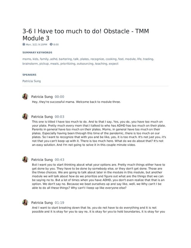 Module 3 Mon, 3/21 9:10PM 8:00 SUMMARY KEYWORDS moms, kids, family, adhd, bartering, talk, plates, recognize, cooking, feel, module, life, trading, brainstorm, pickup, meals, prioritizing, outsourcing, teaching, expect SPEAKERS Patricia Sung Patricia Sung 00:00 Hey, they're successful mama. Welcome back to module three. Patricia Sung 00:03 This one is titled I have too much to do. And to that I say, Yes, you do, you have too much on your plate. Pretty much every mom that I talked to who has ADHD has too much on their plate. Parents in general have too much on their plates. Moms, in general have too much on their plates. Especially having been through this time of the pandemic, there is too much on our plates. So I want to recognize that with you and be like, yes, it is too much. It's not just you, it's not that you can't keep up with it. There is too much here. What do we do about that? It's not an easy solution. And I'm not going to solve it in this couple minute video. Patricia Sung 00:43 But I want you to start thinking about what your options are. Pretty much things either have to get done by you. They have to be done by somebody else, or they don't get done. Those are the three choices. We are going to talk about later in the module in this module, but another module we will talk about how do we prioritize and figure out what are the things that we can be saying no to. But a lot of times when you have ADHD, you don't even realize that that is an option. We don't say no. Because we beat ourselves up and say like, well, we Why can't I be able to do all these things? Why can't I keep up like everyone else? Patricia Sung 01:19 And I want to start breaking down that lie, you do not have to do everything and it is not possible and it is okay for you to say no, it is okay for you to hold boundaries, it is okay for you to not do some things. It is okay for your kids to be disappointed that they don't get to do some