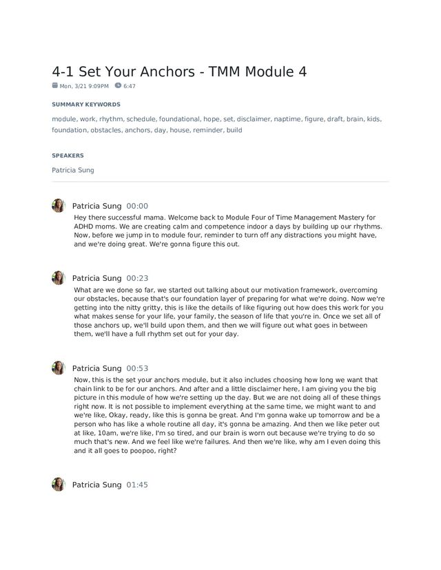 9:09PM 6:47 SUMMARY KEYWORDS module, work, rhythm, schedule, foundational, hope, set, disclaimer, naptime, figure, draft, brain, kids, foundation, obstacles, anchors, day, house, reminder, build SPEAKERS Patricia Sung Patricia Sung 00:00 Hey there successful mama. Welcome back to Module Four of Time Management Mastery for ADHD moms. We are creating calm and competence indoor a days by building up our rhythms. Now, before we jump in to module four, reminder to turn off any distractions you might have, and we're doing great. We're gonna figure this out. Patricia Sung 00:23 What are we done so far, we started out talking about our motivation framework, overcoming our obstacles, because that's our foundation layer of preparing for what we're doing. Now we're getting into the nitty gritty, this is like the details of like figuring out how does this work for you what makes sense for your life, your family, the season of life that you're in. Once we set all of those anchors up, we'll build upon them, and then we will figure out what goes in between them, we'll have a full rhythm set out for your day. Patricia Sung 00:53 Now, this is the set your anchors module, but it also includes choosing how long we want that chain link to be for our anchors. And after and a little disclaimer here, I am giving you the big picture in this module of how we're setting up the day. But we are not doing all of these things right now. It is not possible to implement everything at the same time, we might want to and we're like, Okay, ready, like this is gonna be great. And I'm gonna wake up tomorrow and be a person who has like a whole routine all day, it's gonna be amazing. And then we like peter out at like, 10am, we're like, I'm so tired, and our brain is worn out because we're trying to do so much that's new. And we feel like we're failures. And then we're like, why am I even doing this and it all goes to poopoo, right? Patricia Sung 01:45