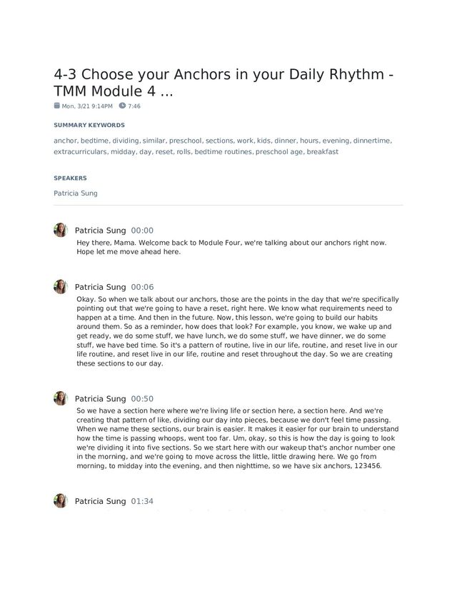 Module 4 ... Mon, 3/21 9:14PM 7:46 SUMMARY KEYWORDS anchor, bedtime, dividing, similar, preschool, sections, work, kids, dinner, hours, evening, dinnertime, extracurriculars, midday, day, reset, rolls, bedtime routines, preschool age, breakfast SPEAKERS Patricia Sung Patricia Sung 00:00 Hey there, Mama. Welcome back to Module Four, we're talking about our anchors right now. Hope let me move ahead here. Patricia Sung 00:06 Okay. So when we talk about our anchors, those are the points in the day that we're specifically pointing out that we're going to have a reset, right here. We know what requirements need to happen at a time. And then in the future. Now, this lesson, we're going to build our habits around them. So as a reminder, how does that look? For example, you know, we wake up and get ready, we do some stuff, we have lunch, we do some stuff, we have dinner, we do some stuff, we have bed time. So it's a pattern of routine, live in our life, routine, and reset live in our life routine, and reset live in our life, routine and reset throughout the day. So we are creating these sections to our day. Patricia Sung 00:50 So we have a section here where we're living life or section here, a section here. And we're creating that pattern of like, dividing our day into pieces, because we don't feel time passing. When we name these sections, our brain is easier. It makes it easier for our brain to understand how the time is passing whoops, went too far. Um, okay, so this is how the day is going to look we're dividing it into five sections. So we start here with our wakeup that's anchor number one in the morning, and we're going to move across the little, little drawing here. We go from morning, to midday into the evening, and then nighttime, so we have six anchors, 123456. Patricia Sung 01:34 Now, anchors one and six are decided for us for when we wake up, and when we go sleep. So