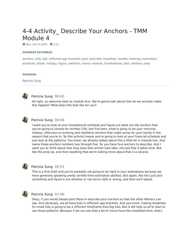 3/21 9:15PM 2:21 SUMMARY KEYWORDS anchors, kids, talk, different age brackets, post, describe, breakfast, weekly meeting, estimation, schedule, photo, midday, figure, patterns, mama, module, foundational, plan, abilities, prep SPEAKERS Patricia Sung Patricia Sung 00:00 All right, so welcome back to module four. We're gonna talk about how do we actually make this happen? What does this look like for you? Patricia Sung 00:08 I want you to look at your foundational schedule and figure out what are the anchors that you're going to choose for number 234, and five here, what is going to be your morning, midday, afternoon or evening and nighttime anchors that make sense for your family in the season that you're in. So this activity means you're going to look at your financial schedule and just look at the patterns. You know, we already talked about this a little bit in module two. And name those anchors numbers two through five. So you have four anchors to describe. And I want you to think about how long does that anchor task take, not just that it takes time. But like the prep do, and then resetting that we're talking more about that in a second. Patricia Sung 00:53 This is a first draft and you're probably not going to be right in your estimations because we have generally speaking pretty terrible time estimation abilities. But again, like let's just pick something and figure it out whether or not we're right or wrong, and then we'll adjust. Patricia Sung 01:06 Okay, if you would please post those in describe your anchors so that the other Mama's can see. And obviously, we all have kids in different age brackets. And you know, making breakfast for small kids is going to be a different timeframe than big kids. But it will help us all to start to see those patterns. Because if we can see that a lot of moms have like breakfast time, that's