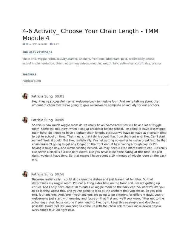 Mon, 3/21 9:16PM 3:27 SUMMARY KEYWORDS chain link, wiggle room, activity, earlier, anchors, front end, breakfast, post, realistically, chose, actual implementation, chain, upcoming videos, module, length, talk, estimates, cutoff, day, crazier SPEAKERS Patricia Sung Patricia Sung 00:01 Hey, they're successful mama, welcome back to module four. And we're talking about the amount of chain that we're going to give ourselves to complete an activity for our anchors. Patricia Sung 00:09 So this is how much wiggle room do we really have? Some activities will have a lot of wiggle room, some will not. Now, when I look at breakfast before school, I'm going to have less wiggle room here. So I need to have a tighter chain length, because we have to leave at a certain time to get to school on time. That means that I think about like, from the front end, like, Can I start earlier? Well, it could. But like, realistically, I'm not getting up earlier to make breakfast. So that chain link isn't going to get any longer on the front end. If he's having a rough day, or I'm having a rough day, and we're running behind, we may need a little more time to eat. But really like seven o'clock is our like hard cutoff, like you have to be done eating at this time, we just right, we don't have time. So that means I have about a 10 minutes of wiggle room on the back end. Patricia Sung 00:58 Because realistically, I could skip clean the dishes and just leave that for later. So that determines my wiggle room. I'm not putting extra time on the front end, I'm not getting up earlier. And I only have about 10 minutes of wiggle room on the back end. So what I'd like you to do is think about this, and you're going to look at the anchors that you chose. So you pick two, four anchors. And, and if your anchors are going to be different for different days, you're welcome to just start with one day and focus on that first and we'll you know, flitter out to the other days later, focus on one if you need to, like, try to keep this as simple and doable as possible. Don't feel like you need to come up with the chain link for you know, seven days a week times four. All right now.