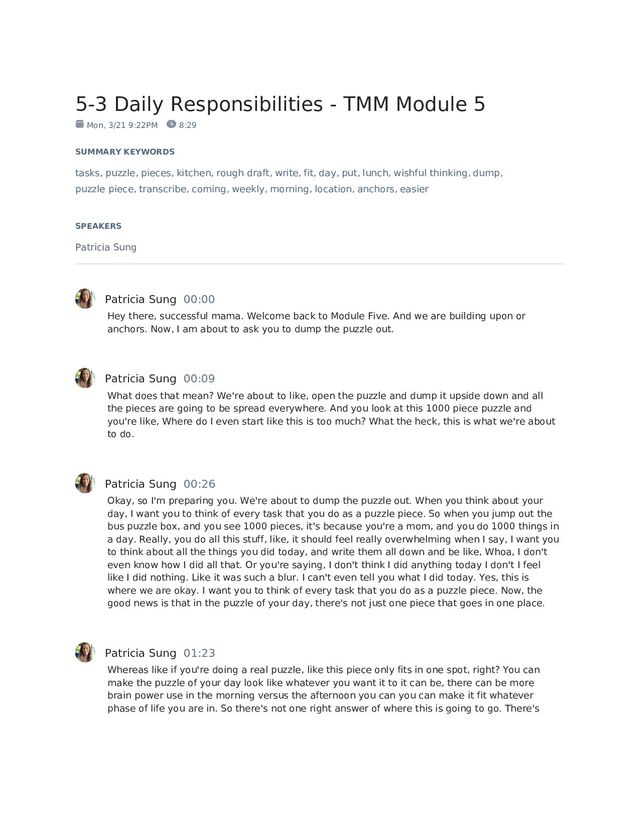 day. Now you can add more stuff later. So just your jump out as many things as your brain can think of at one point, you can write them on paper, you can write them on, like on your phone on a note, it doesn't matter to me how you write it, but I do want you to write it down because you are going to refer back so even if you're doing like a transcribe app on your phone and talking, make sure that it just like transcribes for you so that you have an actual list to refer back to. So you can add more things later. Like this isn't the end all be all, but I want you to write down everything that you do in a day and try not to panic because when I did this exercise for my business fellow panicky I'm not gonna lie. Patricia Sung 04:58 I'm like, wow, I do all of this stuff. How do I do all this stuff? And you start to see like the things that you're not doing, and you get a little panicky, because you're like, Well, I really shouldn't be doing this. It's okay, we're gonna get there. Right now, we're not worrying about the shoulds and adjusts, and all that stuff like, we can only do a little bit at a time, we, we can't change your whole life in the next five minutes, or the next day, we will get there. Right now we're doing one thing. Patricia Sung 05:27 All right. Part two of this activity is that once you have gotten all this information out, I want you to start to sort them and you're grouping the like tasks together. You This is the filter I want you to use when you're thinking about it, first by location. So things because I want you to think forward of like, things that have to be in in the kitchen, we're going to do when we're already in the kitchen for something else, we're not going to make a point to like circle back to the kitchen later if we don't have to. So we're going to start by trying to clump them together by location. So all the things that happen in the kitchen, you know, if your laundry rooms near the kitchen, you can put those tasks nearby that you know, getting the kids ready in the morning, or like bathroom tasks. put those all together. And then secondarily, by timing, so if something has to happen in the morning, like, you know, putting shoes on and, you know, putting back back together, if you do that in the morning, clump those together and tests that go in the morning, if that's something that you prep at night, put it in the group at night. Patricia Sung 06:33 So this is your like, general goal is to group the tasks by location. Because that'll be easier when you're trying to sort where they go on anchors of like, if this is a kitchen task, I'll put it when I'm already in the kitchen timing, I need to go certain part of my day. And this first sort is just a rough draft, there's going to be some that don't fit in any other categories, there's going to be some that you're like, I don't know what I should do this, that's fine. This is just a rough sort. Because, again, we're going to tackle them one at a time. And we're going to pick the easy things first. Patricia Sung 07:06 So, you know, we're gonna start with the obvious things till we gain our competence. And then