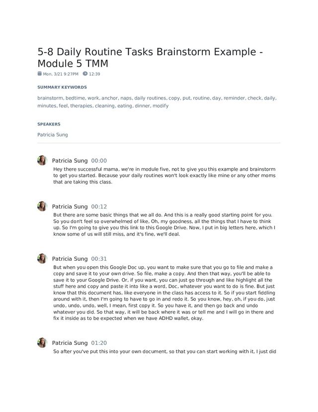Mon, 3/21 9:27PM 12:39 SUMMARY KEYWORDS brainstorm, bedtime, work, anchor, naps, daily routines, copy, put, routine, day, reminder, check, daily, minutes, feel, therapies, cleaning, eating, dinner, modify SPEAKERS Patricia Sung Patricia Sung 00:00 Hey there successful mama, we're in module five, not to give you this example and brainstorm to get you started. Because your daily routines won't look exactly like mine or any other moms that are taking this class. Patricia Sung 00:12 But there are some basic things that we all do. And this is a really good starting point for you. So you don't feel so overwhelmed of like, Oh, my goodness, all the things that I have to think up. So I'm going to give you this link to this Google Drive. Now, I put in big letters here, which I know some of us will still miss, and it's fine, we'll deal. Patricia Sung 00:31 But when you open this Google Doc up, you want to make sure that you go to file and make a copy and save it to your own drive. So file, make a copy. And then that way, you'll be able to save it to your Google Drive. Or, if you want, you can just go through and like highlight all the stuff here and copy and paste it into like a word, Doc, whatever you want to do is fine. But just know that this document has, like everyone in the class has access to it. So if you start fiddling around with it, then I'm going to have to go in and redo it. So you know, hey, oh, if you do, just undo, undo, undo, well, I mean, first copy it. So you have it, and then go back and undo whatever you did. So that way, it will be back where it was or tell me and I will go in there and fix it inside as to be expected when we have ADHD wallet, okay. Patricia Sung 01:20 So after you've put this into your own document, so that you can start working with it, I just did a really quick brainstorm of the parts of our day that happen every single day. This is daily