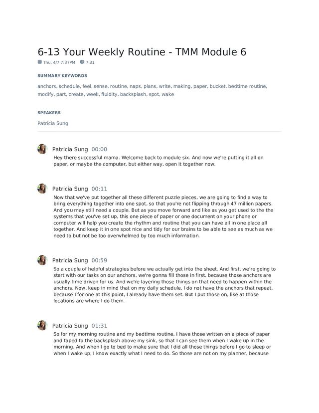 taking medicine, showering, making sure that I drink some water in the morning, those kinds of things. So just like FYI, they're not those two things are not going to be on the sheet. Because, you know, we're we're trying to balance having everything in one place, but not be so overwhelming. And that is something you can post in the location, that makes sense. And you don't have to carry that around with you. Patricia Sung 02:24 We also want to imbalance planning with real time like, as much as we put all of these plans in place, like there is something to be said for flowing with the day and making sure that we're being present and that we're not so focused on what the plan is that we're not enjoying the moment. And it's going to feel like a bit of a struggle when you're first trying to get everything in order. And it's gonna feel awkward. But we talked about that valley of disappointment is that in that first part where we're trying to make all this work, and it feels like we're not making headway and it's going to be awkward and uncomfortable. We know that we're we expect that. And then once we start to settle into that rhythm, and it'll start to feel good and make more sense, okay. But we do want to make sure that we are accommodating for like real life and that this whole the routine and the schedule that we're making, is to serve you, not for you to serve it. So it is always there to assist you not to be like you know, a stick to beat yourself over the head with. Patricia Sung 03:30 Okay. Next one is easier said than done avoiding over committing. When we create these plans, sometimes we like playing every minute of the day. And then we don't have any room for flexibility. So the minute that one tiny thing goes wrong, it throws the whole schedule off. So want to make sure that we have that free space in there and make it work for you. It should fit you it should fit your personalities, it should fit your values. When I look at this schedule, I should be able to tell what it is that's most important to you. Also, remember that we're looking for our patterns and use those to your advantage. Figure out where you can create more efficiencies and and, you know, if you're feeling more tired in certain parts of the day, like make those your rest times and adjust in so that you can fit what makes sense for you. And lastly, of course, I'm sure I've said it a bazillion times now but remember changes necessary. Patricia Sung 04:38 I mean, that's the only certain part of life is that things will change and our kids are growing and they're modifying what they do every day. You know, they're outgrowing naps, then they're going to school and have a different schedule like it isn't this is meant to be a structure in a framework that makes sense for you but you You are going to have to modify it. You know, it might fall apart at, you know the holidays, but you can then go back to it after the holidays and like restart over again, it's okay that we chilled out for that week, no one's going to be horrifically scared because we didn't follow our pattern exactly. There is that room for fluidity, but it is going to change. And as soon as you feel like you've got the hang of you know, your kid having two naps, they're going on to one nap. And as soon as you feel like you got the one that thing down, and they go, and they don't want to naps anymore. I mean, this is just part of being a mom, so bear with us where we're getting through it.