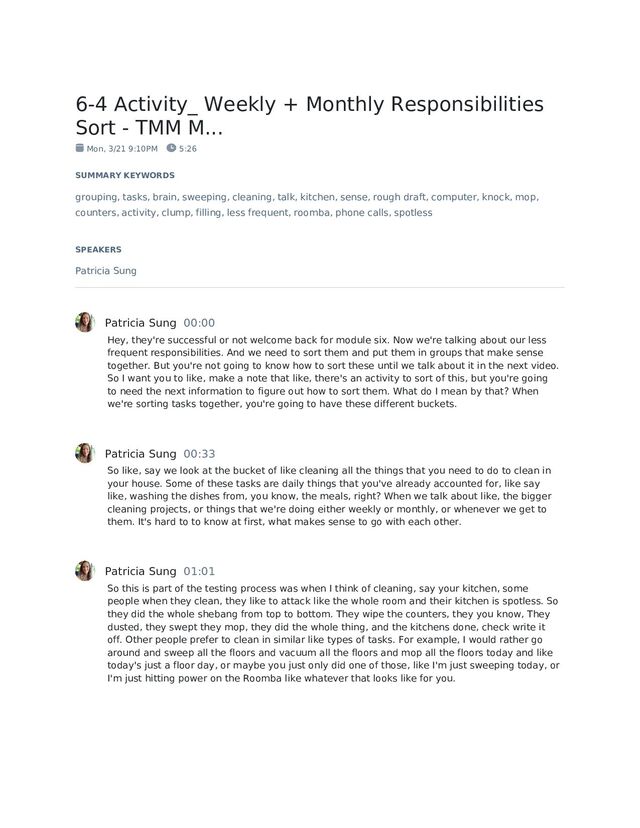 Mon, 3/21 9:10PM 5:26 SUMMARY KEYWORDS grouping, tasks, brain, sweeping, cleaning, talk, kitchen, sense, rough draft, computer, knock, mop, counters, activity, clump, filling, less frequent, roomba, phone calls, spotless SPEAKERS Patricia Sung Patricia Sung 00:00 Hey, they're successful or not welcome back for module six. Now we're talking about our less frequent responsibilities. And we need to sort them and put them in groups that make sense together. But you're not going to know how to sort these until we talk about it in the next video. So I want you to like, make a note that like, there's an activity to sort of this, but you're going to need the next information to figure out how to sort them. What do I mean by that? When we're sorting tasks together, you're going to have these different buckets. Patricia Sung 00:33 So like, say we look at the bucket of like cleaning all the things that you need to do to clean in your house. Some of these tasks are daily things that you've already accounted for, like say like, washing the dishes from, you know, the meals, right? When we talk about like, the bigger cleaning projects, or things that we're doing either weekly or monthly, or whenever we get to them. It's hard to to know at first, what makes sense to go with each other. Patricia Sung 01:01 So this is part of the testing process was when I think of cleaning, say your kitchen, some people when they clean, they like to attack like the whole room and their kitchen is spotless. So they did the whole shebang from top to bottom. They wipe the counters, they you know, They dusted, they swept they mop, they did the whole thing, and the kitchens done, check write it off. Other people prefer to clean in similar like types of tasks. For example, I would rather go around and sweep all the floors and vacuum all the floors and mop all the floors today and like today's just a floor day, or maybe you just only did one of those, like I'm just sweeping today, or I'm just hitting power on the Roomba like whatever that looks like for you.
