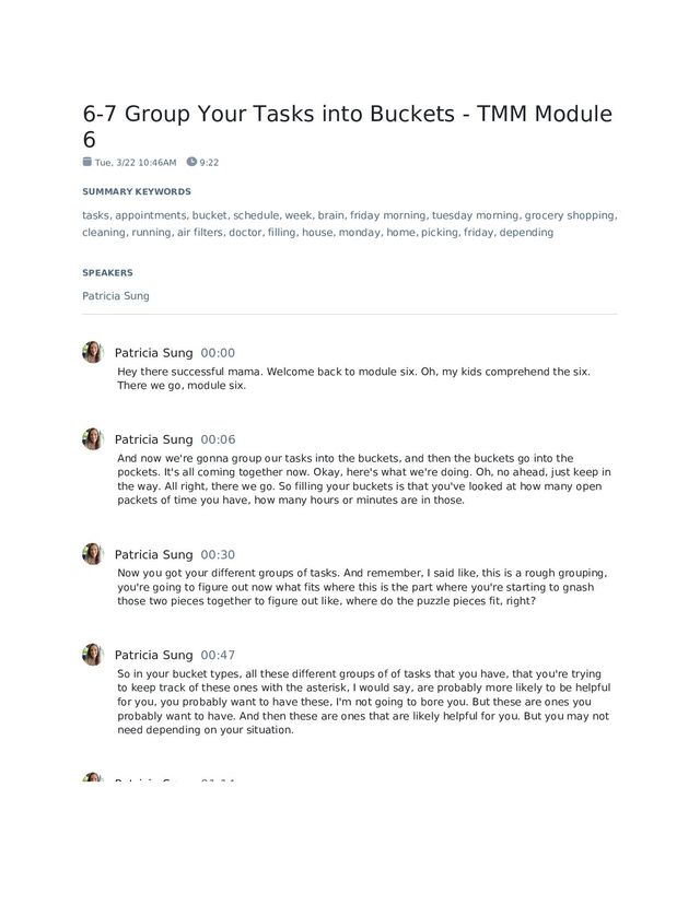going to vary week to week, you're not a robot, you're not going to do the exact same thing every time. But we want to start defining these parameters around it. Because if we know for example, for me, my home, like taking care of my home bucket is Monday afternoon, and on Monday afternoon, I know that I'm going to tackle things around my house, that means like picking up all the crap that got like left out over the weekend. And if I have things like I need to change the air filters in the house, I'm going to put that on Monday. Patricia Sung 01:54 I need to check the Bode like go check the sprinkler timer. I think something's off on it. I put it on Monday. Because when all those things are popping up in my brain, and I'm feeling anxious, because my brain is like, Oh, don't forget this. Don't forget this. Don't forget this. It is exhausting. So when I think of those tasks now that my brain knows, okay, I handle things on the House on Monday, I immediately can go to Monday, write down that thing that needs to happen for the house. And there it is. And I know that I'm going to be at home, I don't schedule other things on Monday afternoons, I don't go other places. Patricia Sung 02:34 My brain knows like, I will be at my house and can handle these things on Monday. When I get to Monday, and I look at my bucket of home tasks, I'll be like, Okay, what really matters today, what has to get done today? You know what? Click air filters can wait till next week, not a problem. Patricia Sung 02:55 What are the things that I have to do today? Okay, well, I definitely need to fix the sprinkler timer, because I'm getting rained on every time I walk to school, faster house. So let me fix that. That matters to me today. Let me deal with that. And by creating a home for these things, it allows our brain to like turn off the mental clutter because our brain knows, okay, cool. Patricia Sung 03:15 Don't stress about this task, because it's going to happen on Monday, when you do your Monday home tasks. And so like your home things, your cleaning things all can be grouped together, or they can be separate, you can have a separate cleaning bucket and a separate home bucket. And if you're like if you have rent, maybe you don't have as much home stuff to do. Patricia Sung 03:39 But you still have cleaning things to do. You have a group for like errands and grocery shopping, running to the library dropping this thing off picking up dry cleaning, when you're already in the car and out and about running, handling all those things is a lot easier than like,