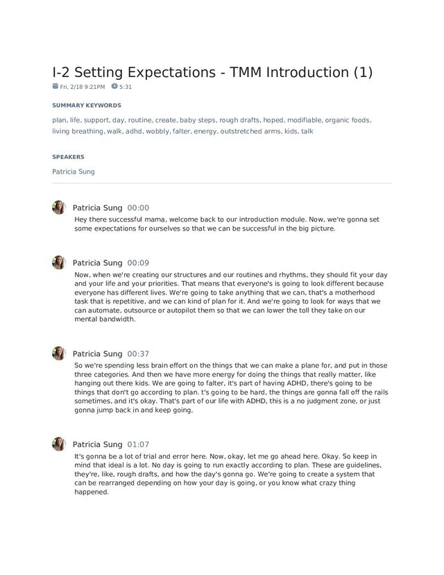 5:31 SUMMARY KEYWORDS plan, life, support, day, routine, create, baby steps, rough drafts, hoped, modifiable, organic foods, living breathing, walk, adhd, wobbly, falter, energy, outstretched arms, kids, talk SPEAKERS Patricia Sung Patricia Sung 00:00 Hey there successful mama, welcome back to our introduction module. Now, we're gonna set some expectations for ourselves so that we can be successful in the big picture. Patricia Sung 00:09 Now, when we're creating our structures and our routines and rhythms, they should fit your day and your life and your priorities. That means that everyone's is going to look different because everyone has different lives. We're going to take anything that we can, that's a motherhood task that is repetitive, and we can kind of plan for it. And we're going to look for ways that we can automate, outsource or autopilot them so that we can lower the toll they take on our mental bandwidth. Patricia Sung 00:37 So we're spending less brain effort on the things that we can make a plane for, and put in those three categories. And then we have more energy for doing the things that really matter, like hanging out there kids. We are going to falter, it's part of having ADHD, there's going to be things that don't go according to plan. t's going to be hard, the things are gonna fall off the rails sometimes, and it's okay. That's part of our life with ADHD, this is a no judgment zone, or just gonna jump back in and keep going. Patricia Sung 01:07 It's gonna be a lot of trial and error here. Now, okay, let me go ahead here. Okay. So keep in mind that ideal is a lot. No day is going to run exactly according to plan. These are guidelines, they're, like, rough drafts, and how the day's gonna go. We're going to create a system that can be rearranged depending on how your day is going, or you know what crazy thing happened.