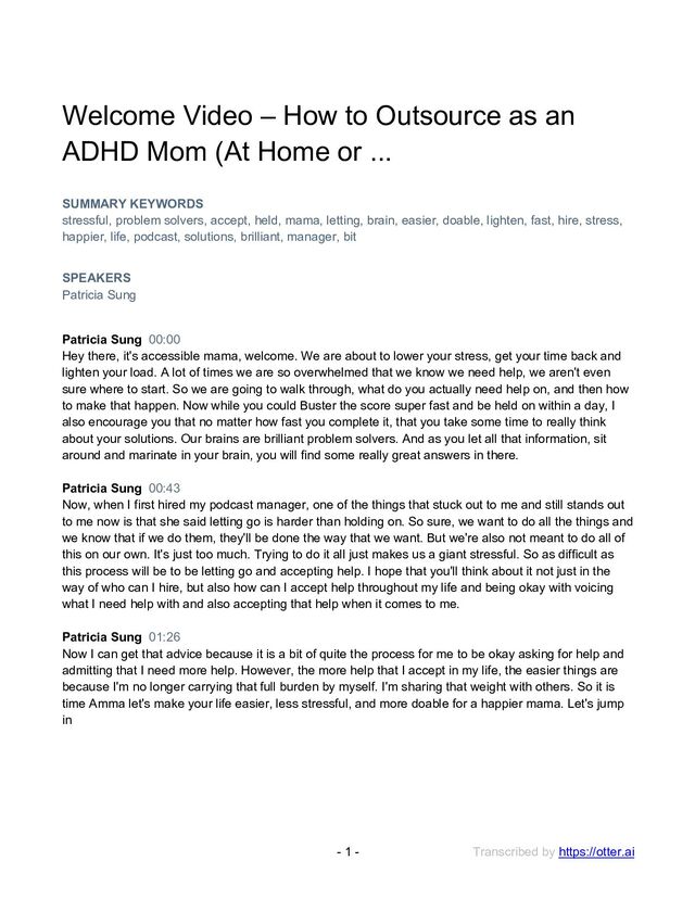 to Outsource as an ADHD Mom (At Home or ... SUMMARY KEYWORDS stressful, problem solvers, accept, held, mama, letting, brain, easier, doable, lighten, fast, hire, stress, happier, life, podcast, solutions, brilliant, manager, bit SPEAKERS Patricia Sung Patricia Sung 00:00 Hey there, it's accessible mama, welcome. We are about to lower your stress, get your time back and lighten your load. A lot of times we are so overwhelmed that we know we need help, we aren't even sure where to start. So we are going to walk through, what do you actually need help on, and then how to make that happen. Now while you could Buster the score super fast and be held on within a day, I also encourage you that no matter how fast you complete it, that you take some time to really think about your solutions. Our brains are brilliant problem solvers. And as you let all that information, sit around and marinate in your brain, you will find some really great answers in there. Patricia Sung 00:43 Now, when I first hired my podcast manager, one of the things that stuck out to me and still stands out to me now is that she said letting go is harder than holding on. So sure, we want to do all the things and we know that if we do them, they'll be done the way that we want. But we're also not meant to do all of this on our own. It's just too much. Trying to do it all just makes us a giant stressful. So as difficult as this process will be to be letting go and accepting help. I hope that you'll think about it not just in the way of who can I hire, but also how can I accept help throughout my life and being okay with voicing what I need help with and also accepting that help when it comes to me. Patricia Sung 01:26 Now I can get that advice because it is a bit of quite the process for me to be okay asking for help and admitting that I need more help. However, the more help that I accept in my life, the easier things are because I'm no longer carrying that full burden by myself. I'm sharing that weight with others. So it is time Amma let's make your life easier, less stressful, and more doable for a happier mama. Let's jump in